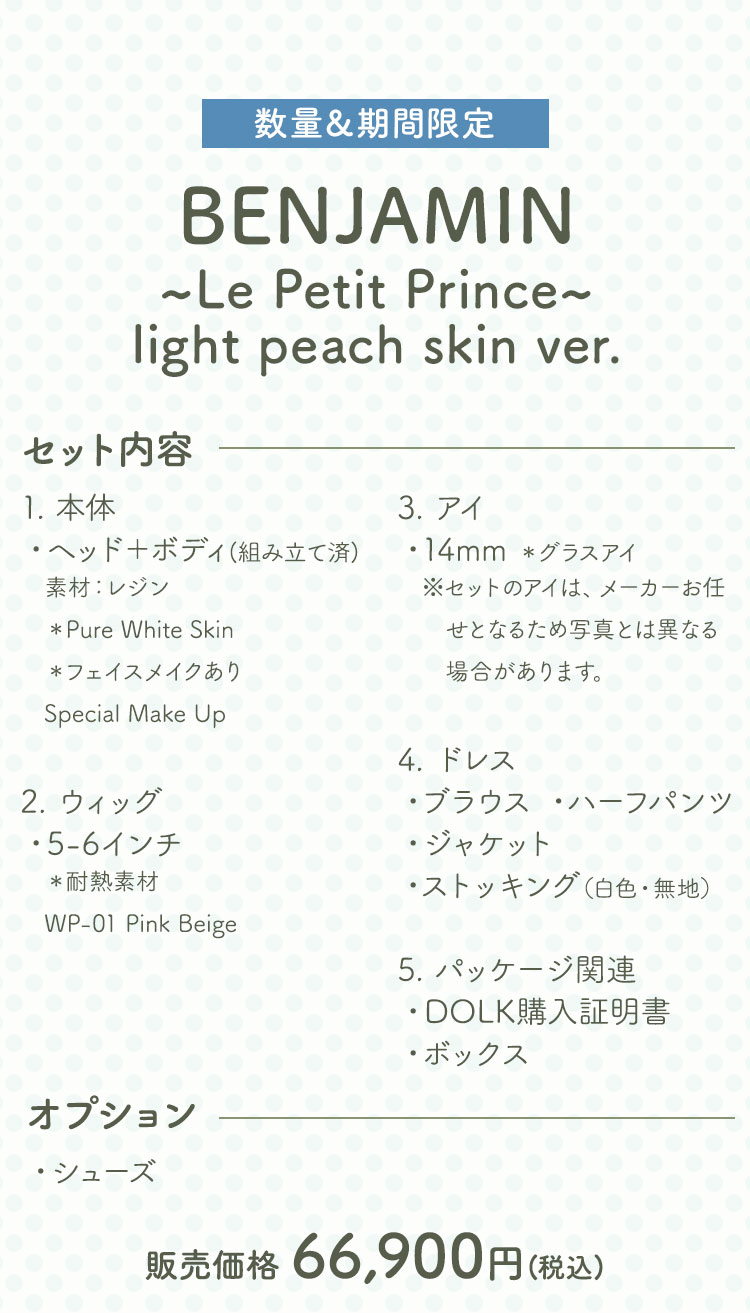 この季節限定の鮮やかなメイクを纏った新作が続々登場しています。 凛とした表情がクールな猫ドール『OSKAR ~Orbit~』が、季節限定メイクアップで彩られて新登場。 お洋服とアイを追加購入していただくことで、そのままの表情を楽しめます。 さらに、不朽の人気を誇る『PICASSO』からも新作が登場! 季節限定の星空のようなメイクアップで更に愛らしくなった『PICASSO Millet 2025 Winter』 宇宙を感じる耳のグラデーションが素敵な 『PICASSO bean 2026 spring』2種類が登場しています。 春の陽気に誘われて現れたウサギ『JULIET ~Purity~』は、可愛らしいフワモコ衣装と共にお届け。桜を閉じ込めたアイも付属のフルセットです。愛らしい「Rose skin」でのお迎えも叶います♪ 加えて『BENJAMIN ~Le Petit Prince~ light peach skin ver.』が、数量限定で新登場! お洋服やウィッグが付属したフルセットとして、BENJAMINがあなたのお家にやってきます。 『JULIET ~Purity~』と『BENJAMIN ~Le Petit Prince~ light peach skin ver.』は数量限定になりますのでお見逃しなく。 このドール達に会えるのは今だけ。 愛らしいドール達とともに、春の訪れを感じてみてはいかがでしょうか♪