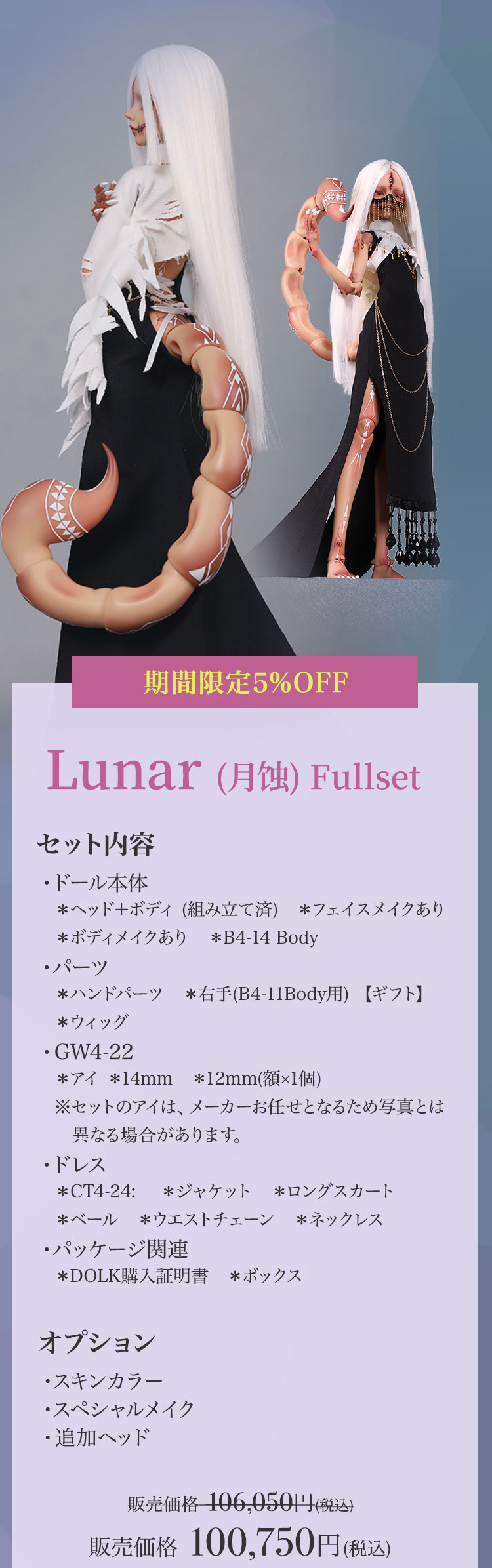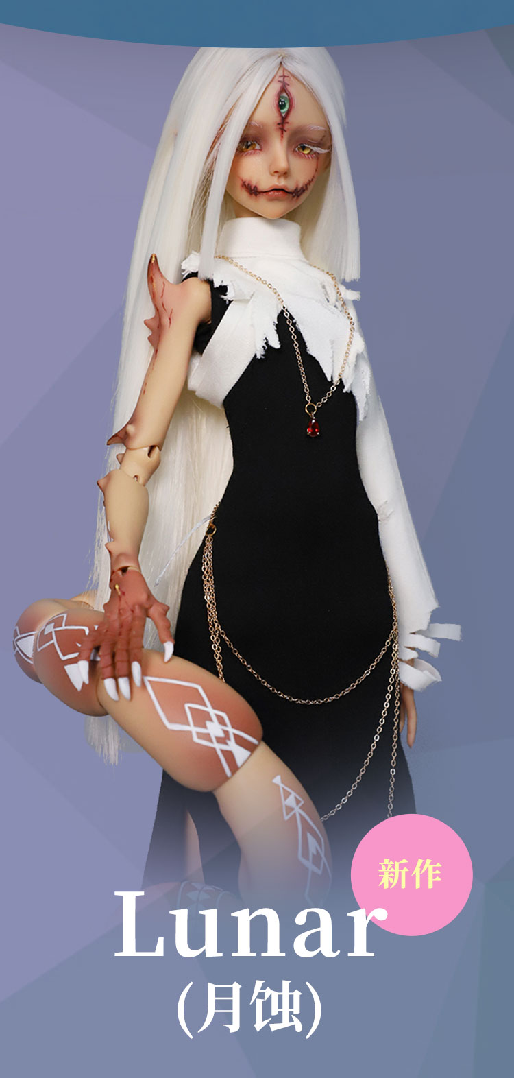 新作『Lunar (月蚀)』『Sundial (日晷)』は、40cmサイズの特殊ボディ女の子ドールです。サソリをモチーフとし、リアリティな傷メイクと尻尾のエスニカリーなペイントが特徴的です。期間限定キャンペーンは、割引やギフトなど盛りだくさんの内容となっております。是非お得なこのチャンスをお見逃しなく!