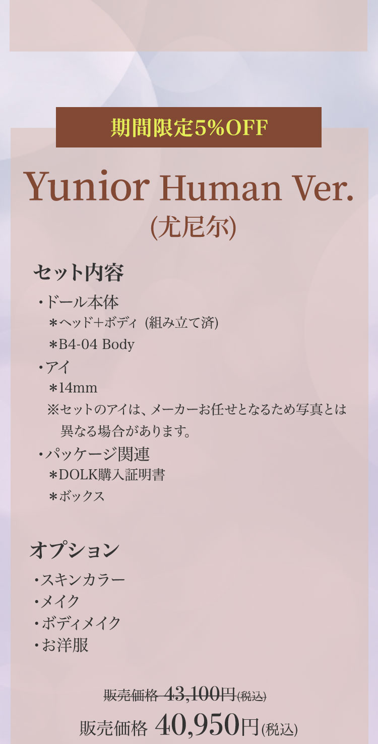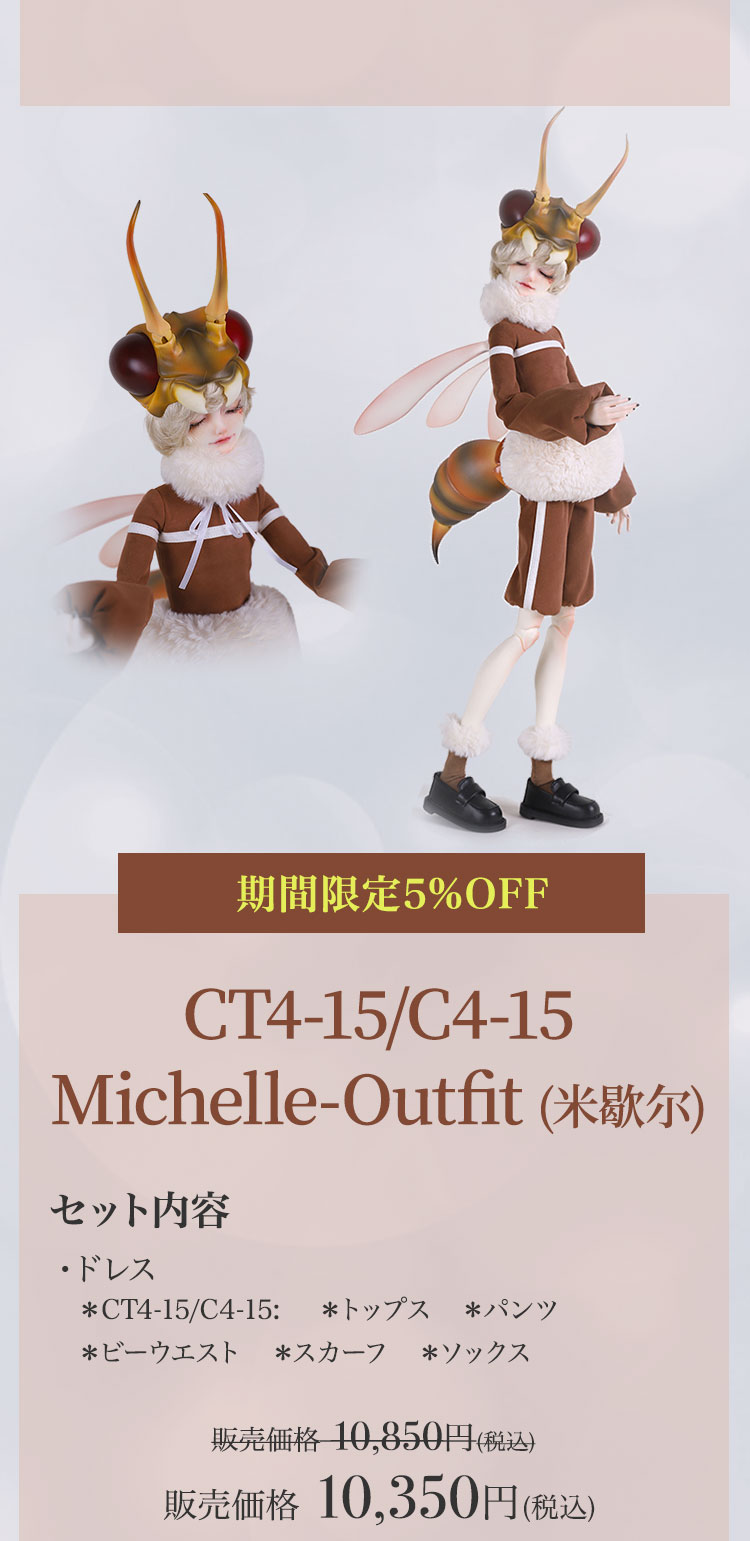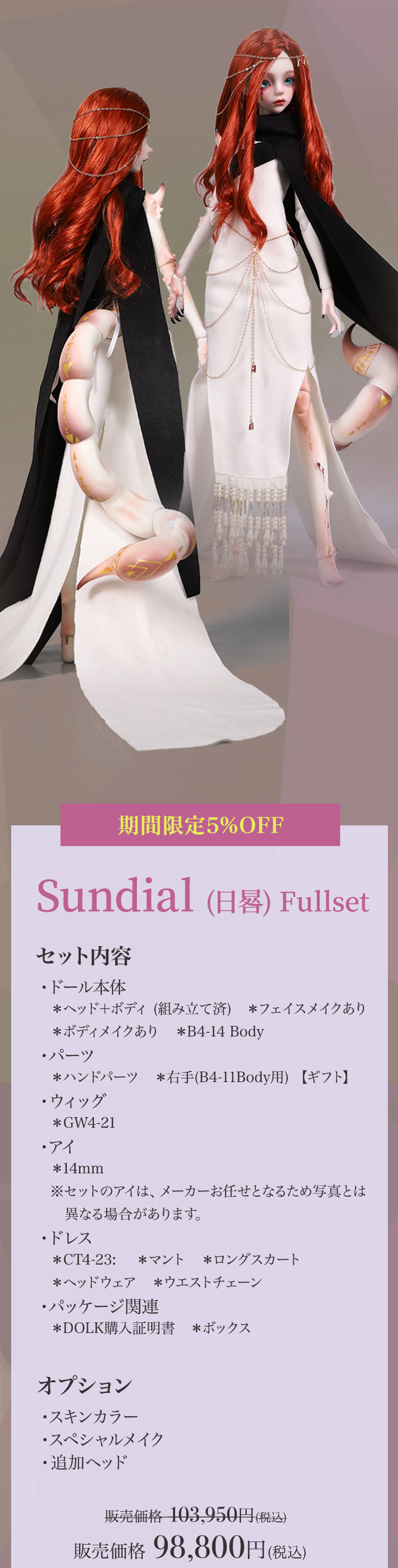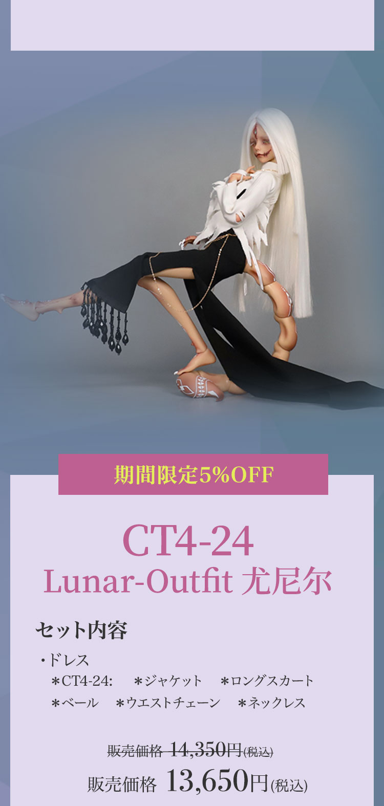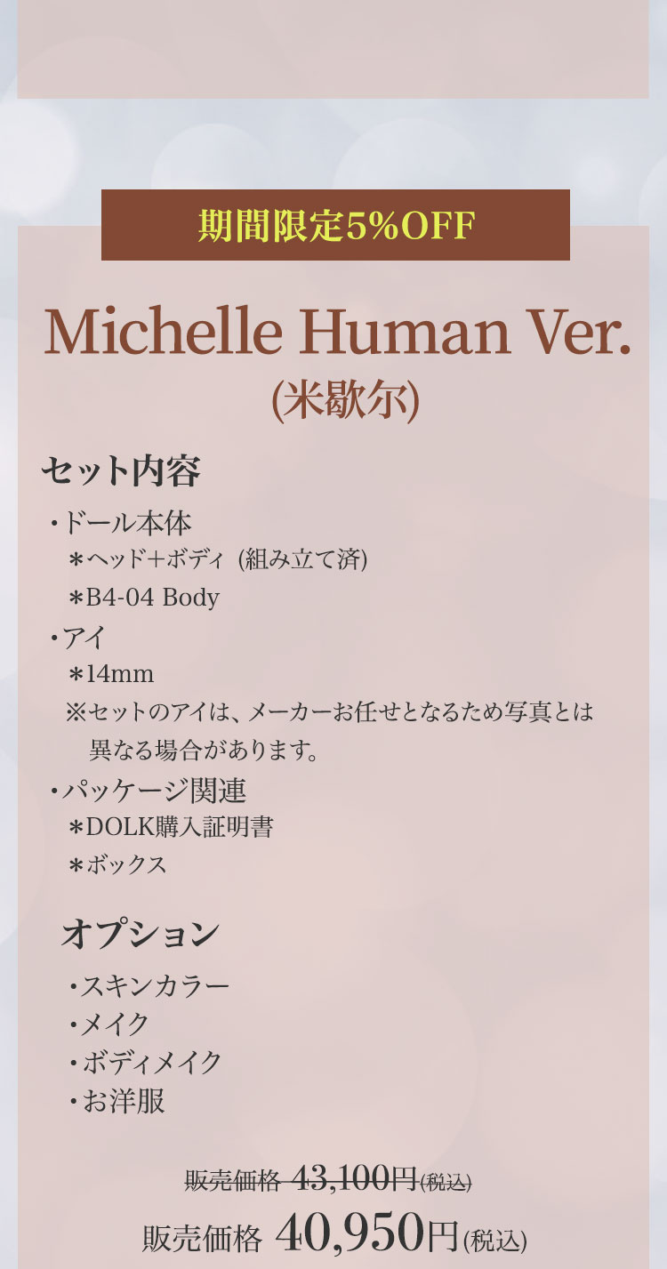 キャンペーン期間内に、 ①新作『Lunar (月蚀)』『Sundial (日晷)』再販『Michelle Bee Ver.(米歇尔)』『Yunior Bee Ver.(尤尼尔)』『Michelle Human Ver.(米歇尔)』『Yunior Human Ver.(尤尼尔)』のフルセットドール・ドール本体セット・ドレス単品が定価より【5%OFF】。 ②新作『Lunar (月蚀)』『Sundial (日晷)』のフルセットドールまたはドール本体セットご購入で【B4-11Body用の右ハンドパーツ】をプレゼント。 ③新作『Lunar (月蚀)』『Sundial (日晷)』のフルセットドールまたはドール本体セットをご購入いただきますと、追加料金【9,850円(税込)】にて追加ヘッド(ノーメイク)ご購入可能。 ④Dream Valley製品【103,950円(税込)】以上ご購入で『Tea (茶茶)』または『Ruby/Nia (鲁比/尼亚)』のいずれか1体プレゼント。