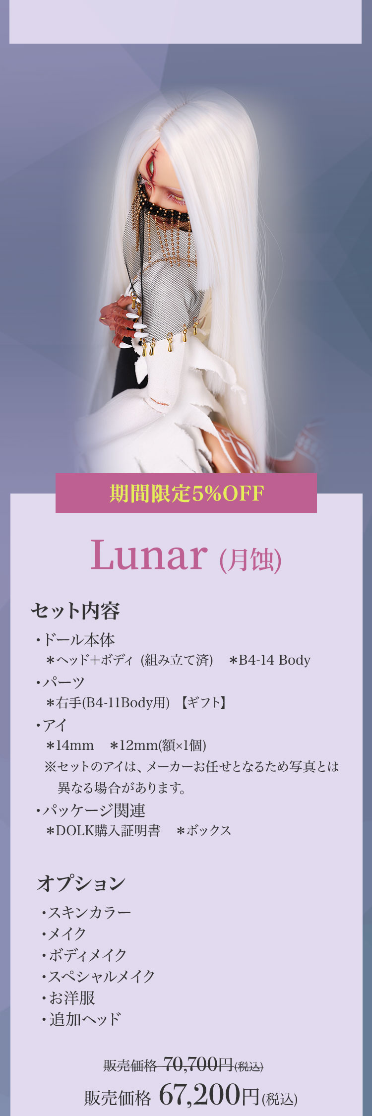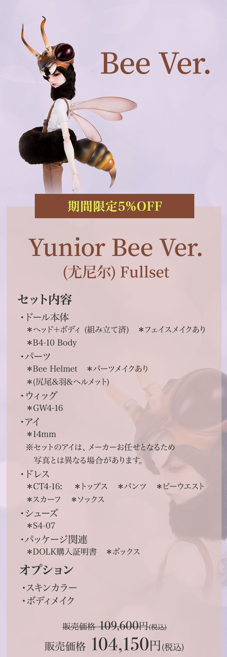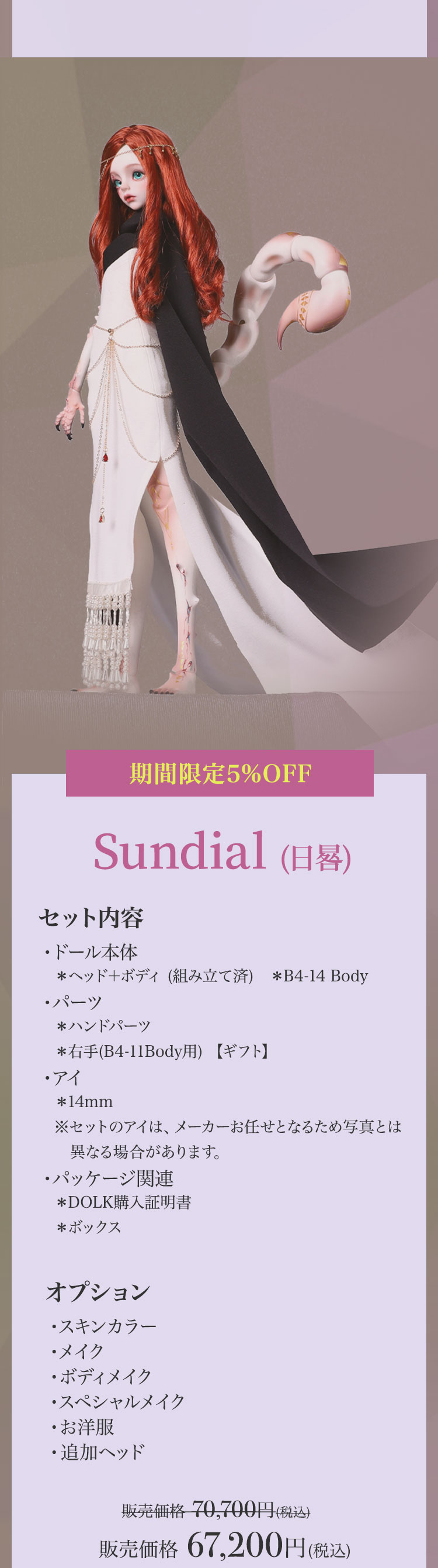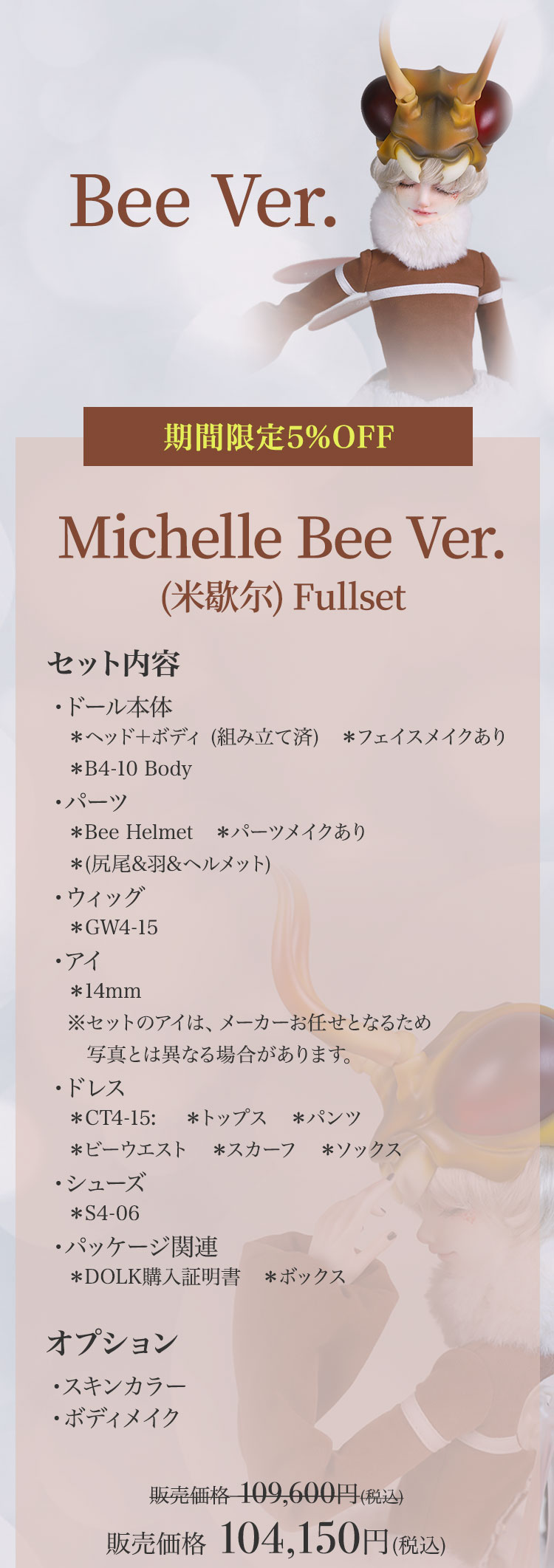 キャンペーン期間内に、 ①新作『Lunar (月蚀)』『Sundial (日晷)』再販『Michelle Bee Ver.(米歇尔)』『Yunior Bee Ver.(尤尼尔)』『Michelle Human Ver.(米歇尔)』『Yunior Human Ver.(尤尼尔)』のフルセットドール・ドール本体セット・ドレス単品が定価より【5%OFF】。 ②新作『Lunar (月蚀)』『Sundial (日晷)』のフルセットドールまたはドール本体セットご購入で【B4-11Body用の右ハンドパーツ】をプレゼント。 ③新作『Lunar (月蚀)』『Sundial (日晷)』のフルセットドールまたはドール本体セットをご購入いただきますと、追加料金【9,850円(税込)】にて追加ヘッド(ノーメイク)ご購入可能。 ④Dream Valley製品【103,950円(税込)】以上ご購入で『Tea (茶茶)』または『Ruby/Nia (鲁比/尼亚)』のいずれか1体プレゼント。