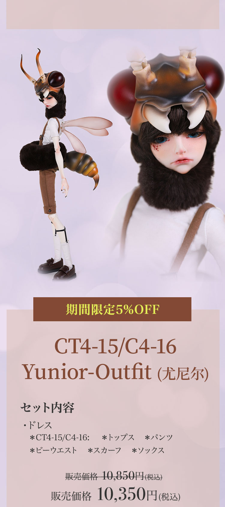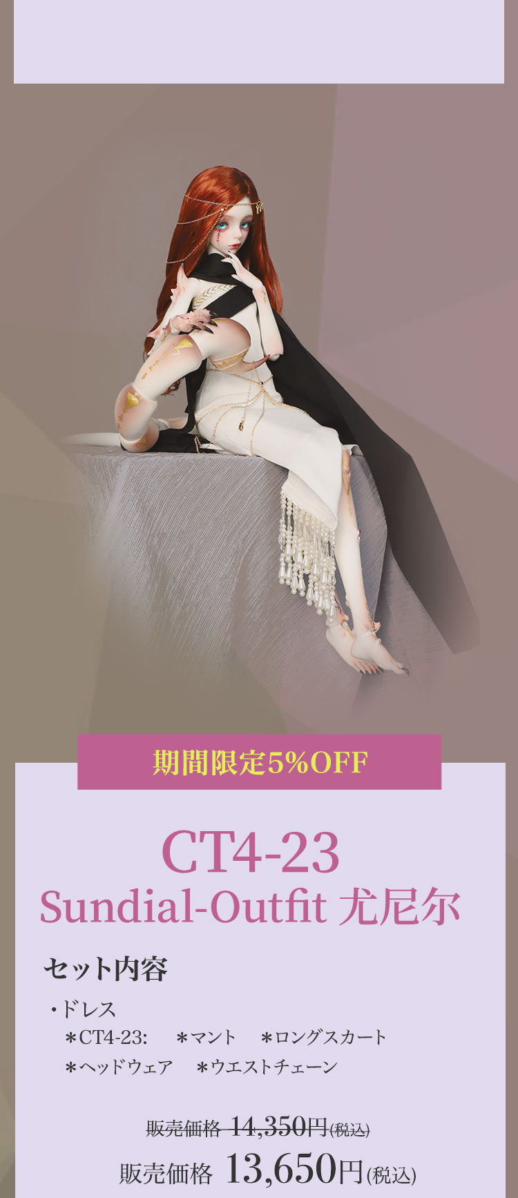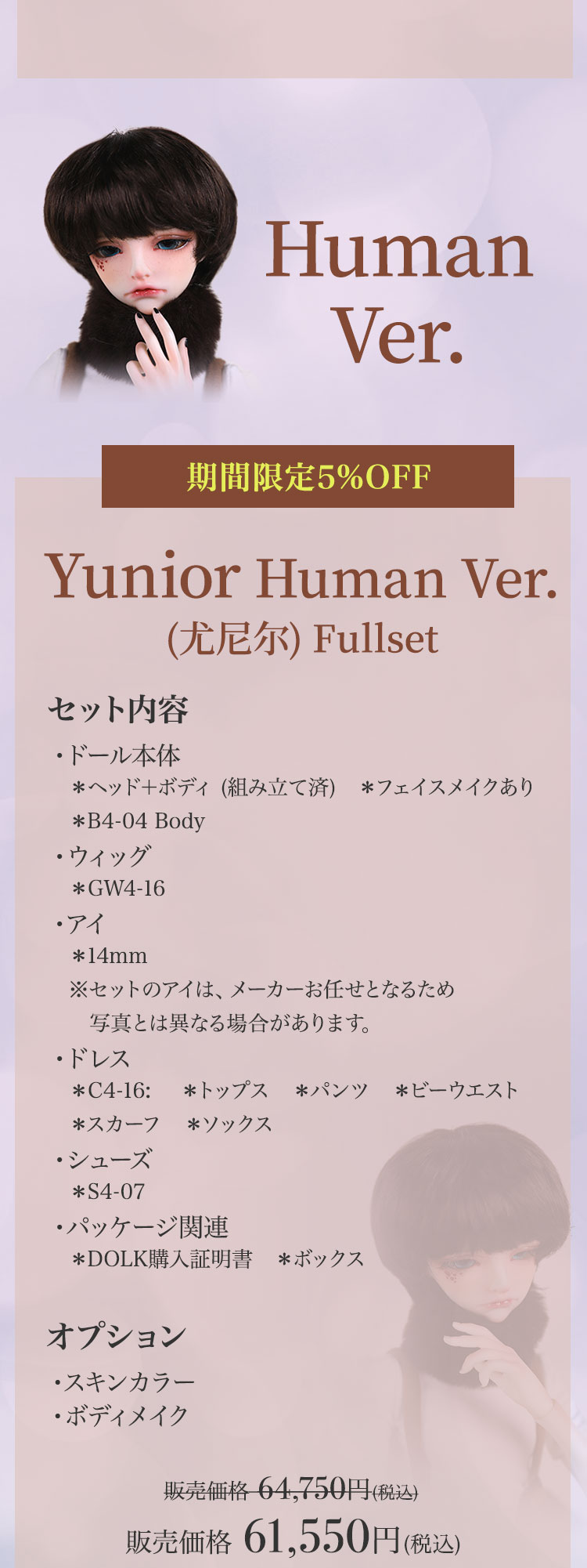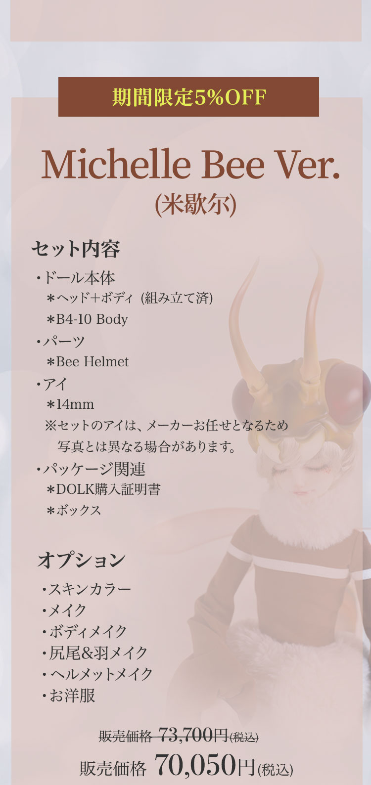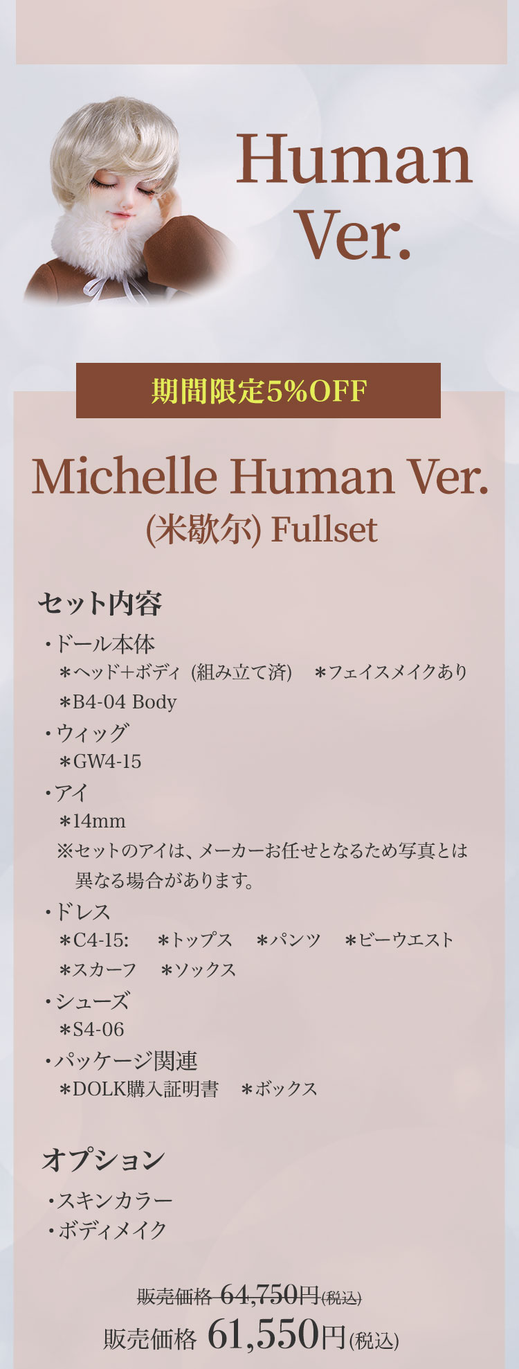 キャンペーン期間内に、 ①新作『Lunar (月蚀)』『Sundial (日晷)』再販『Michelle Bee Ver.(米歇尔)』『Yunior Bee Ver.(尤尼尔)』『Michelle Human Ver.(米歇尔)』『Yunior Human Ver.(尤尼尔)』のフルセットドール・ドール本体セット・ドレス単品が定価より【5%OFF】。 ②新作『Lunar (月蚀)』『Sundial (日晷)』のフルセットドールまたはドール本体セットご購入で【B4-11Body用の右ハンドパーツ】をプレゼント。 ③新作『Lunar (月蚀)』『Sundial (日晷)』のフルセットドールまたはドール本体セットをご購入いただきますと、追加料金【9,850円(税込)】にて追加ヘッド(ノーメイク)ご購入可能。 ④Dream Valley製品【103,950円(税込)】以上ご購入で『Tea (茶茶)』または『Ruby/Nia (鲁比/尼亚)』のいずれか1体プレゼント。