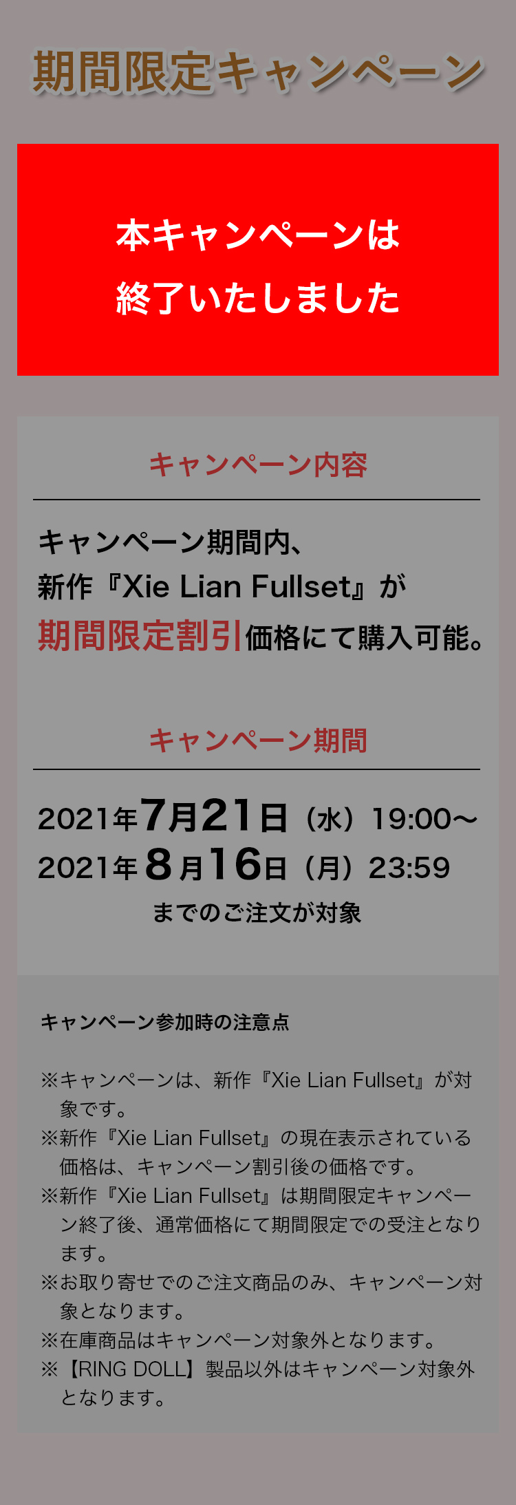 RING DOLLより、中国の大人気ファンタジー小説原作『天官賜福』の謝憐(Xie Lian)キャラクタードールが新たに登場しました! 謝憐の持てる清廉な雰囲気――神官然とした凛々しさが全面に表れていながらも、どこか甘やかさの滲む風貌をRING DOLLが完全再現。 秀麗かつ瑞々しいメイク、花冠を戴くに相応しい黒髪のウィッグ、素朴でありながら品のある白銀の装束までもを携えたフルセットでのお迎えが可能です。 長きに渡る旅路の果て、人間界へと降臨した謝憐の麗姿をどうぞお見逃しなく。