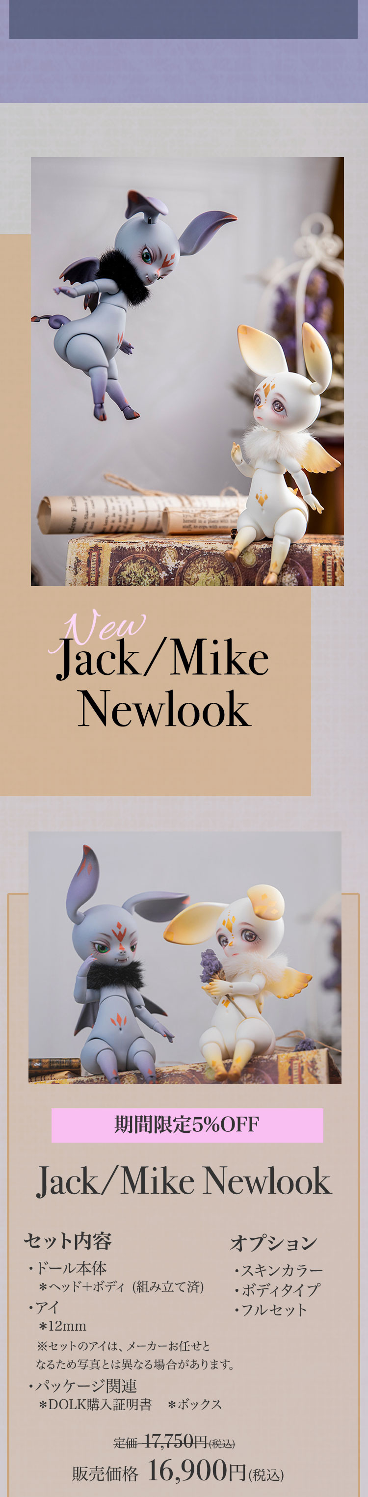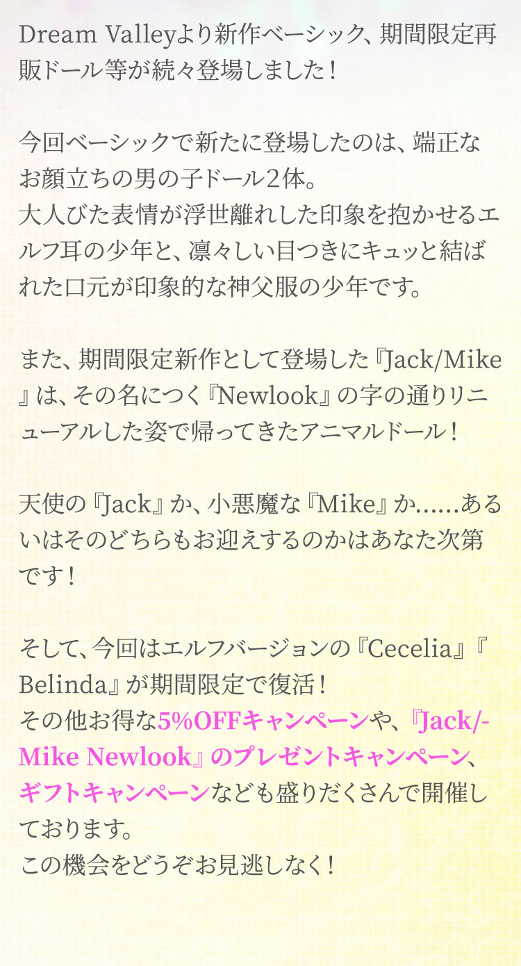 今回ベーシックで新たに登場したのは、端正なお顔立ちの男の子ドール2体。大人びた表情が浮世離れした印象を抱かせるエルフ耳の少年と、凛々しい目つきにキュッと結ばれた口元が印象的な神父服の少年です。 また、期間限定新作として登場した『Jack/Mike』は、その名につく『Newlook』の字の通りリニューアルした姿で帰ってきたアニマルドール!天使の『Jack』か、小悪魔な『Mike』か……あるいはそのどちらもお迎えするのかはあなた次第です! そして、今回はエルフバージョンの『Cecelia』『Belinda』が期間限定で復活! その他お得な【5%OFF】キャンペーンや、『Jack/Mike Newlook』のプレゼントキャンペーン、ギフトキャンペーンなども盛りだくさんで開催しております。 この機会をどうぞお見逃しなく!
