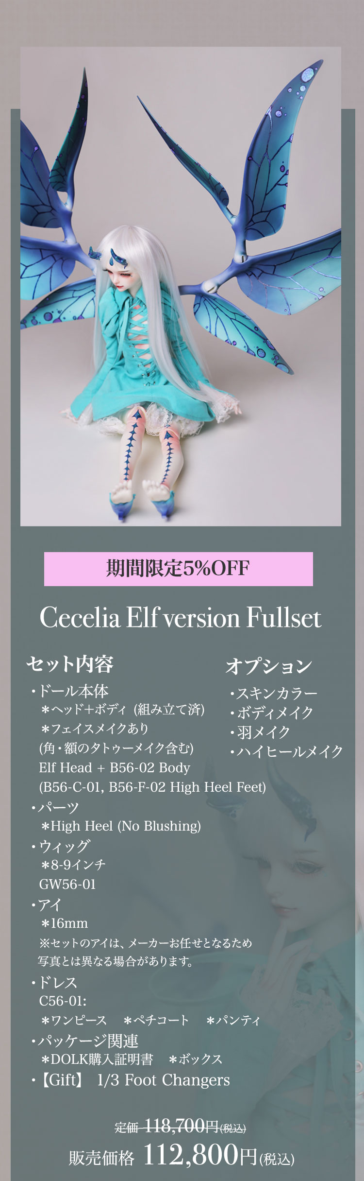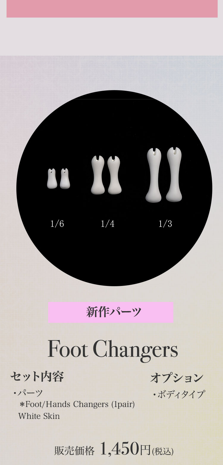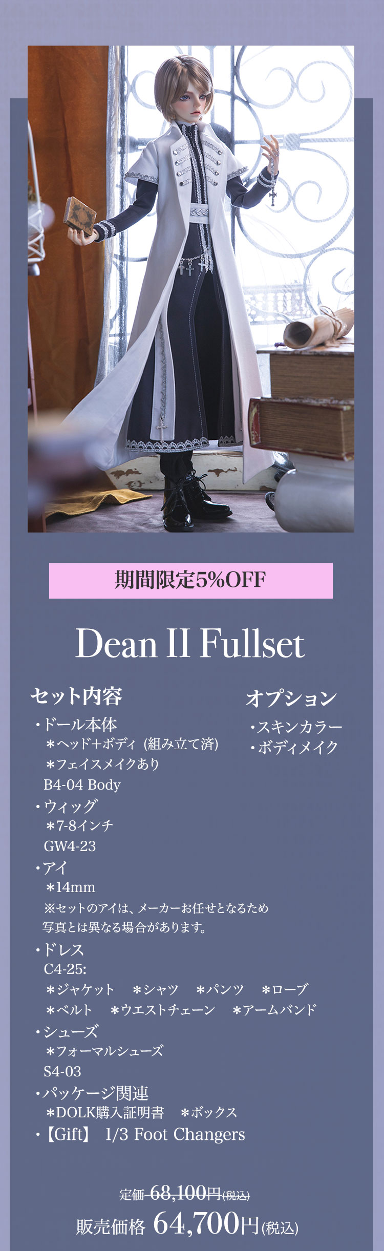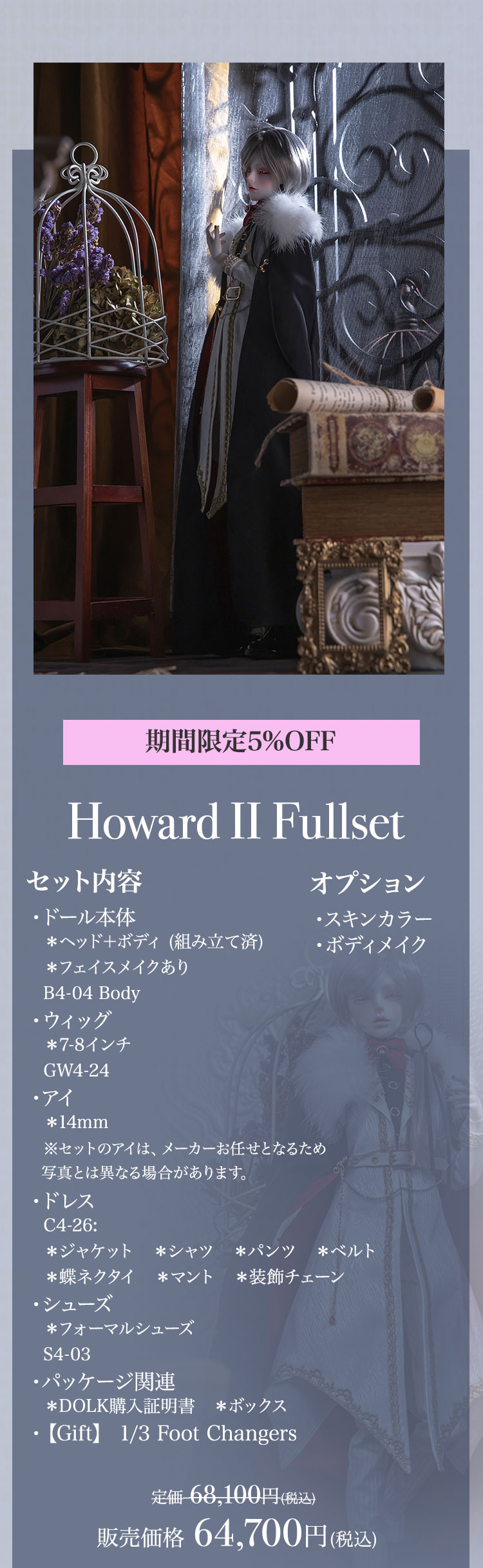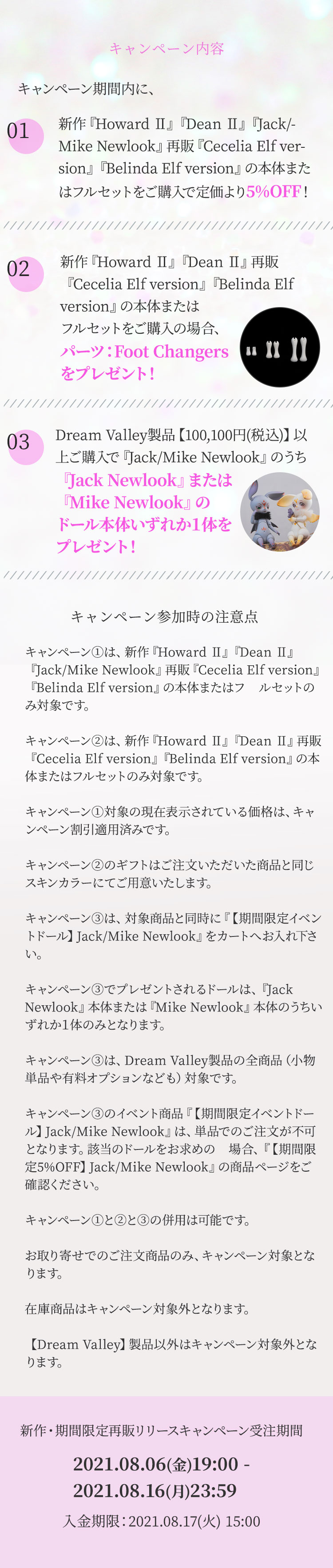 キャンペーン期間内に、 ①新作『Howard Ⅱ』『Dean Ⅱ』『Jack/Mike Newlook』再販『Cecelia Elf version』『Belinda Elf version』の本体またはフルセットをご購入で定価より【5%OFF】! ②新作『Howard Ⅱ』『Dean Ⅱ』再販『Cecelia Elf version』『Belinda Elf version』の本体またはフルセットをご購入の場合、【パーツ:Foot Changers】をプレゼント! ③Dream Valley製品【100,100円(税込)】以上ご購入で『Jack/Mike Newlook』のうち『Jack Newlook』または『Mike Newlook』のドール本体いずれか1体をプレゼント!