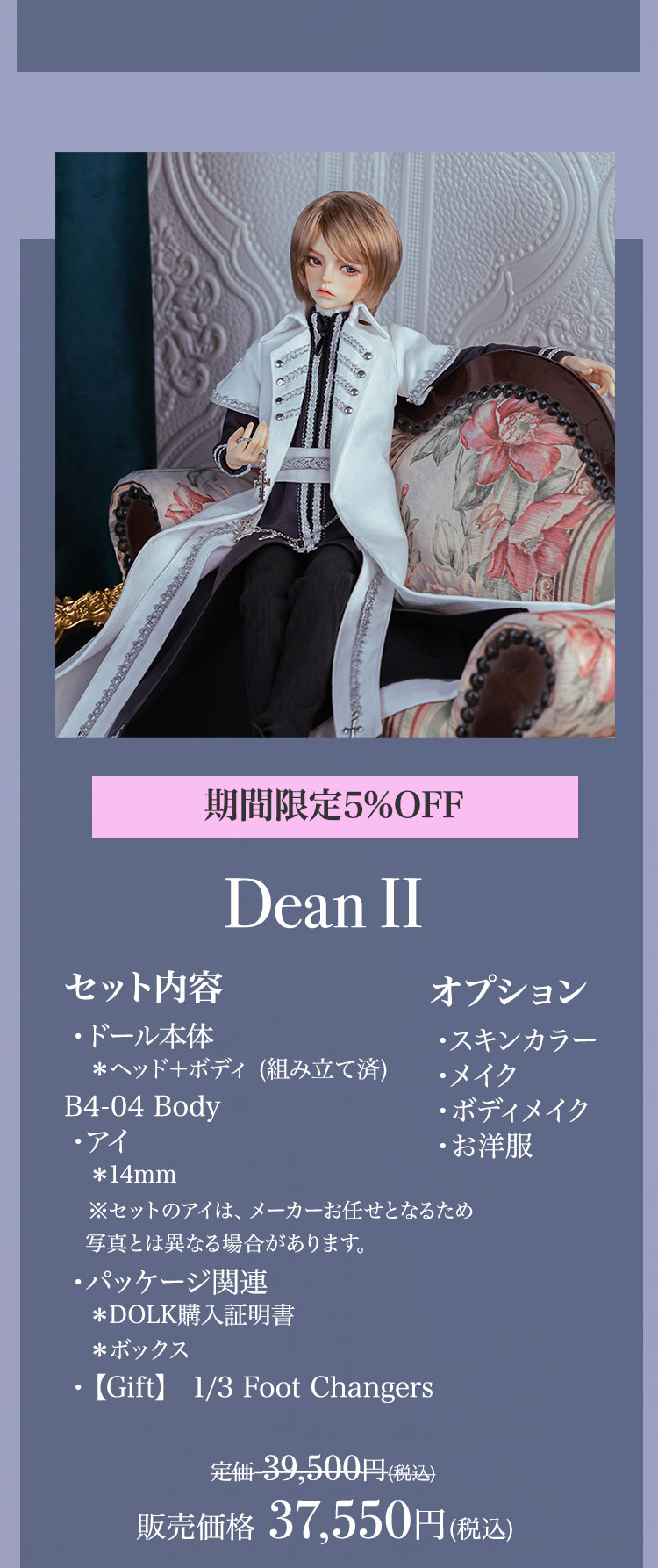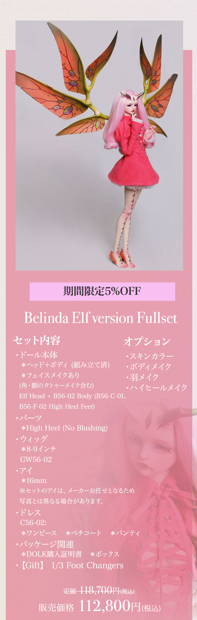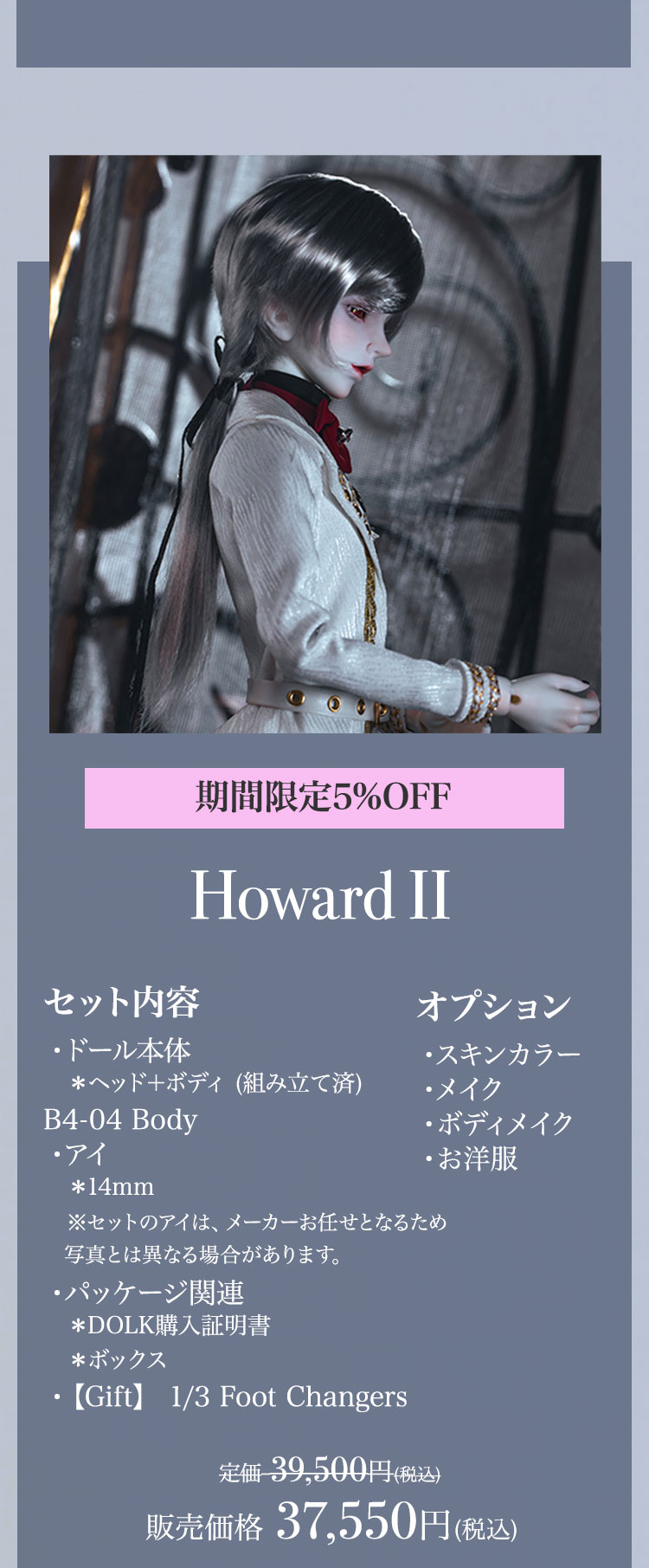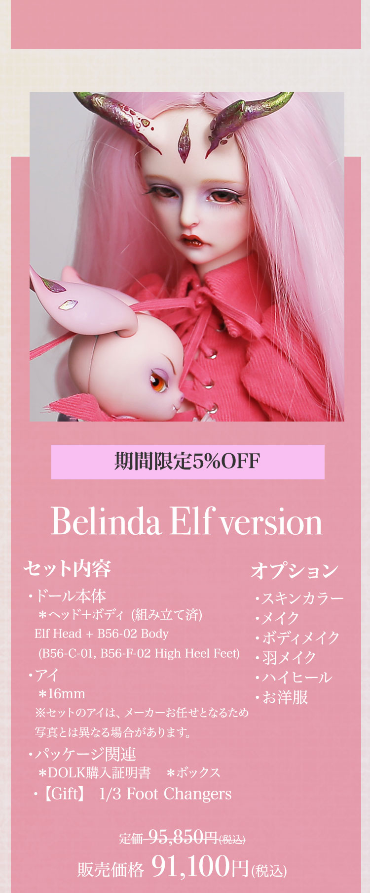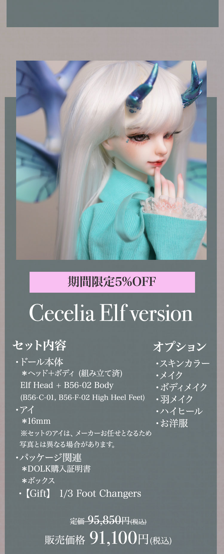 キャンペーン期間内に、 ①新作『Howard Ⅱ』『Dean Ⅱ』『Jack/Mike Newlook』再販『Cecelia Elf version』『Belinda Elf version』の本体またはフルセットをご購入で定価より【5%OFF】! ②新作『Howard Ⅱ』『Dean Ⅱ』再販『Cecelia Elf version』『Belinda Elf version』の本体またはフルセットをご購入の場合、【パーツ:Foot Changers】をプレゼント! ③Dream Valley製品【100,100円(税込)】以上ご購入で『Jack/Mike Newlook』のうち『Jack Newlook』または『Mike Newlook』のドール本体いずれか1体をプレゼント!