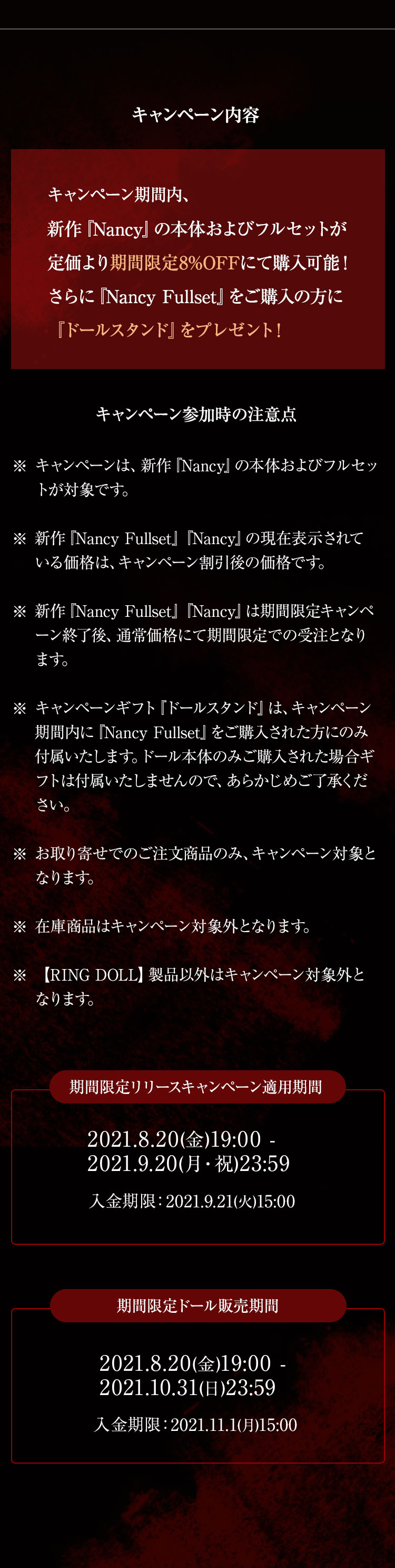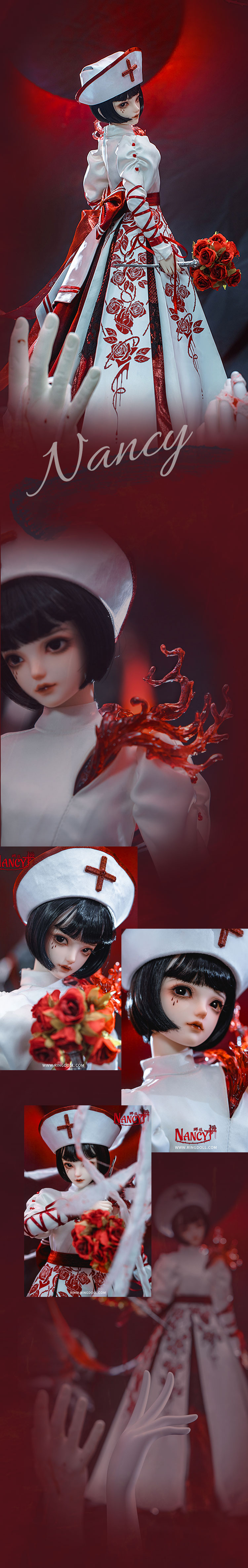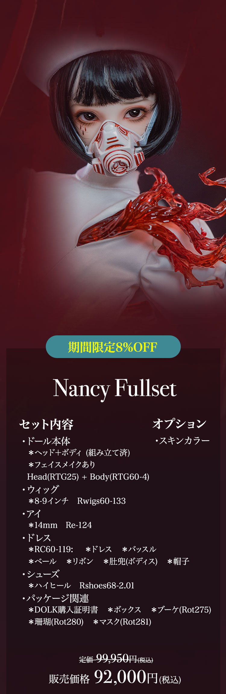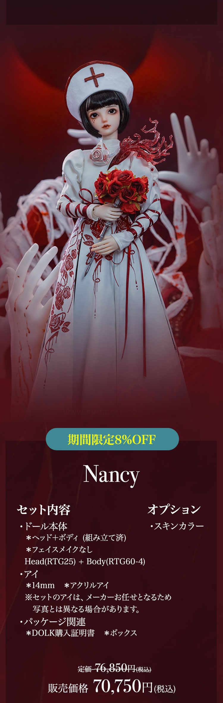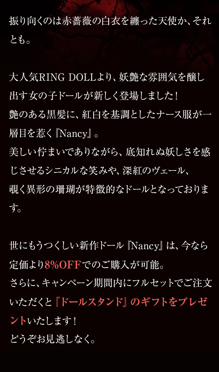 艶のある黒髪に、紅白を基調としたナース服が一層目を惹く『Nancy』。 美しい佇まいでありながら、底知れぬ妖しさを感じさせるシニカルな笑みや、深紅のヴェール、覗く異形の珊瑚が特徴的なドールとなっております。 世にもうつくしい新作ドール『Nancy』は、今なら定価より【8%OFF】でのご購入が可能。 さらに、キャンペーン期間内にフルセットでご注文いただくと『ドールスタンド』のギフトをプレゼントいたします!どうぞお見逃しなく。