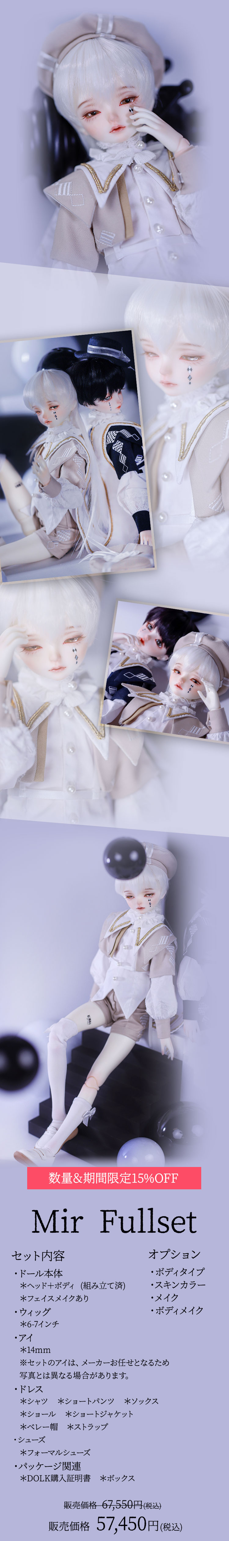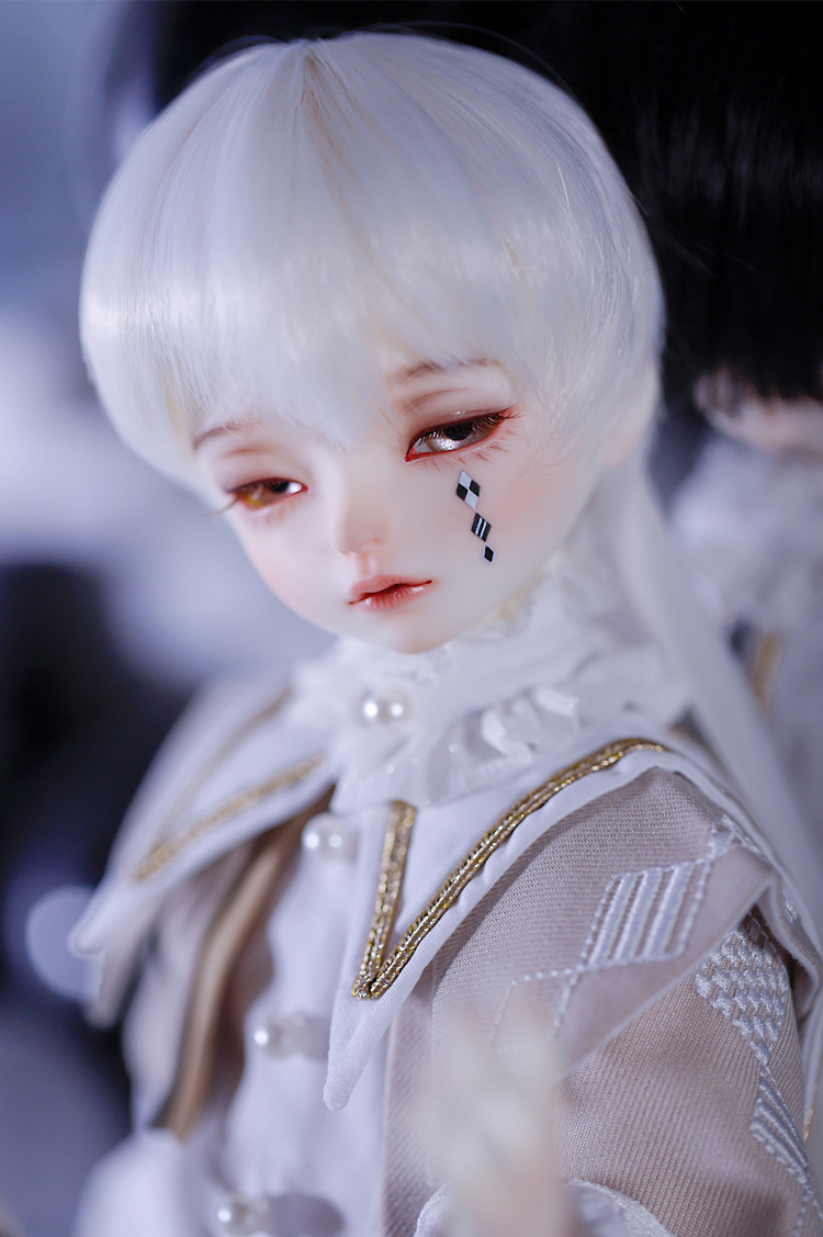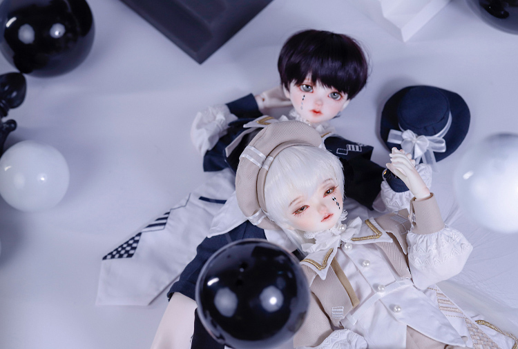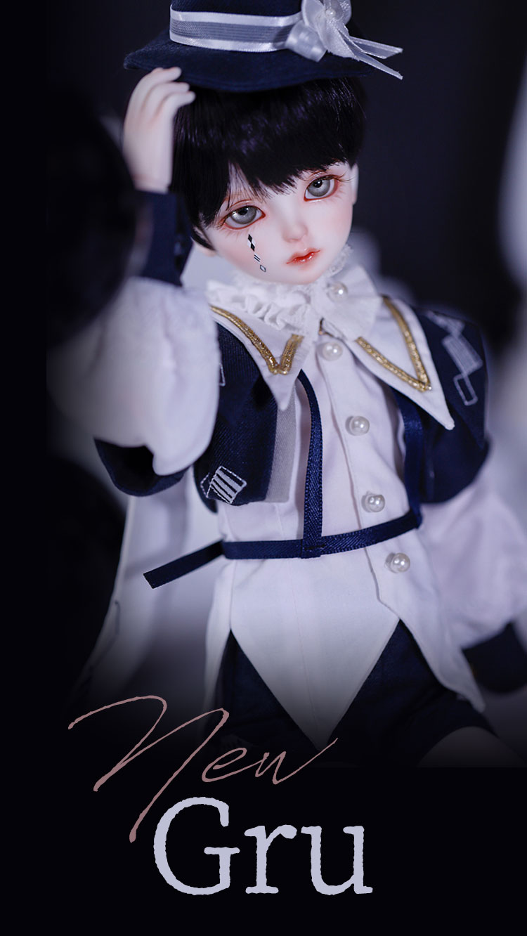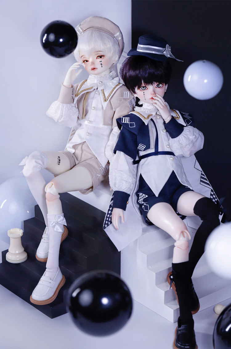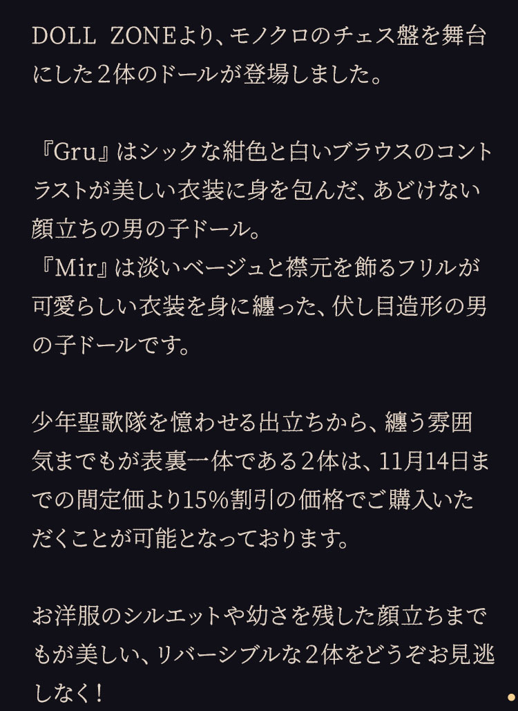 『Gru』はシックな紺色と白いブラウスのコントラストが美しい衣装に身を包んだ、あどけない顔立ちの男の子ドール。 『Mir』は淡いベージュと襟元を飾るフリルが可愛らしい衣装を身に纏った、伏し目造形の男の子ドールです。 少年聖歌隊を憶わせる出立ちから、纏う雰囲気までもが表裏一体である2体は、11月14日までの間定価より15%割引の価格でご購入いただくことが可能となっております。 お洋服のシルエットや幼さを残した顔立ちまでもが美しい、リバーシブルな2体をどうぞお見逃しなく!