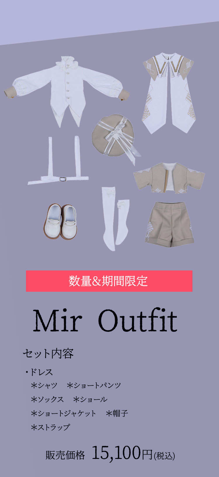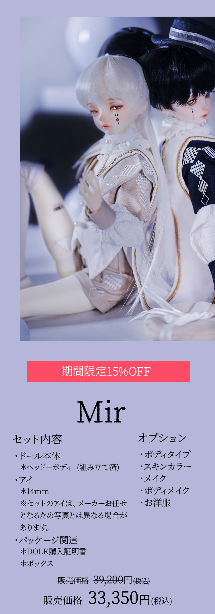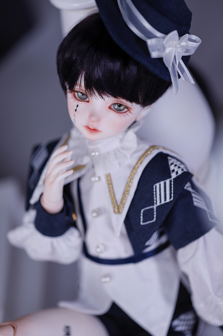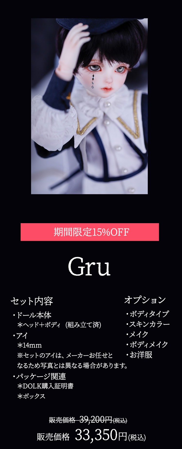 『Gru』はシックな紺色と白いブラウスのコントラストが美しい衣装に身を包んだ、あどけない顔立ちの男の子ドール。 『Mir』は淡いベージュと襟元を飾るフリルが可愛らしい衣装を身に纏った、伏し目造形の男の子ドールです。 少年聖歌隊を憶わせる出立ちから、纏う雰囲気までもが表裏一体である2体は、11月14日までの間定価より15%割引の価格でご購入いただくことが可能となっております。 お洋服のシルエットや幼さを残した顔立ちまでもが美しい、リバーシブルな2体をどうぞお見逃しなく!