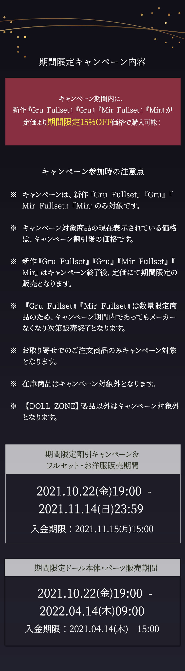 期間限定割引キャンペーン&フルセット・お洋服販売期間:2021.10.22(金) 19:00〜2021.11.14(日) 23:59
