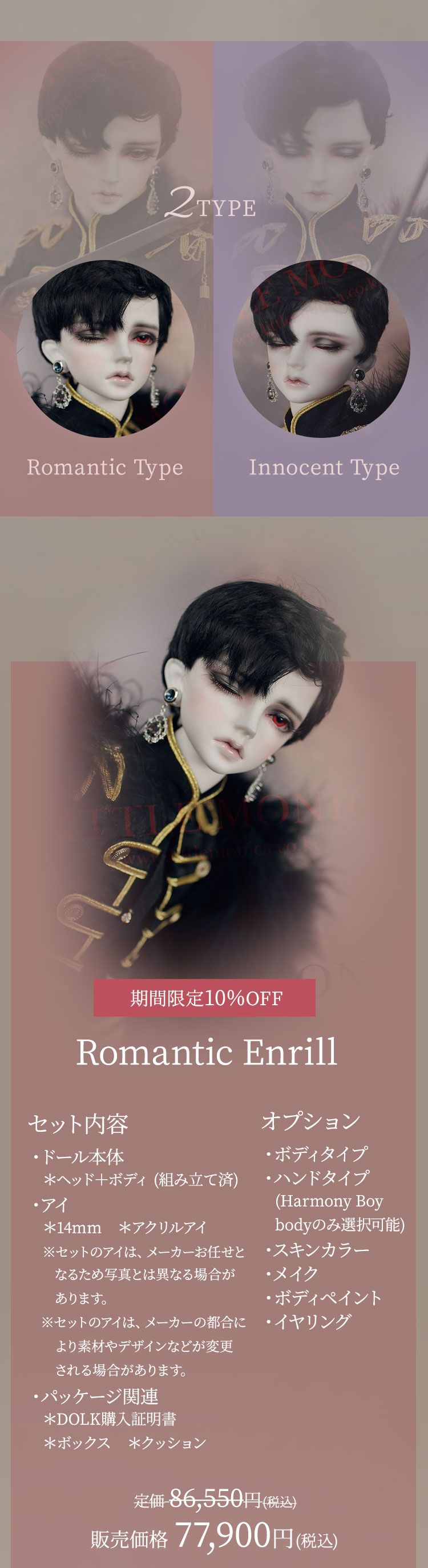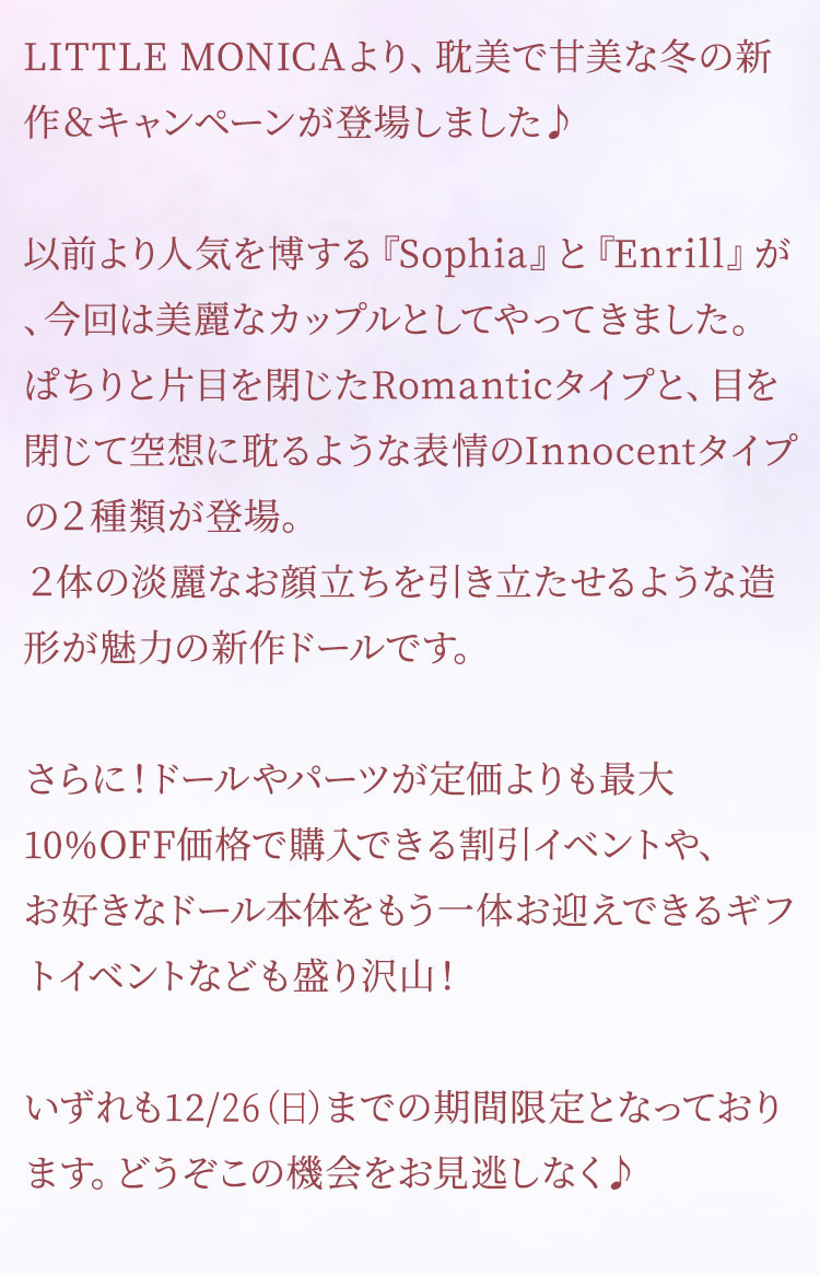 以前より人気を博する『Sophia』と『Enrill』が、今回は美麗なカップルとしてやってきました。 ぱちりと片目を閉じたRamanticタイプと、目を閉じて空想に耽るような表情のInnocentタイプの2種類が登場。 2体の淡麗なお顔立ちを引き立たせるような造形が魅力の新作ドールです。 さらに!ドールやパーツが定価よりも最大10%OFF価格で購入できる割引イベントや、お好きなドール本体をもう一体お迎えできるギフトイベントなども盛り沢山! いずれも12/23(木)までの期間限定となっております。どうぞこの機会をお見逃しなく♪