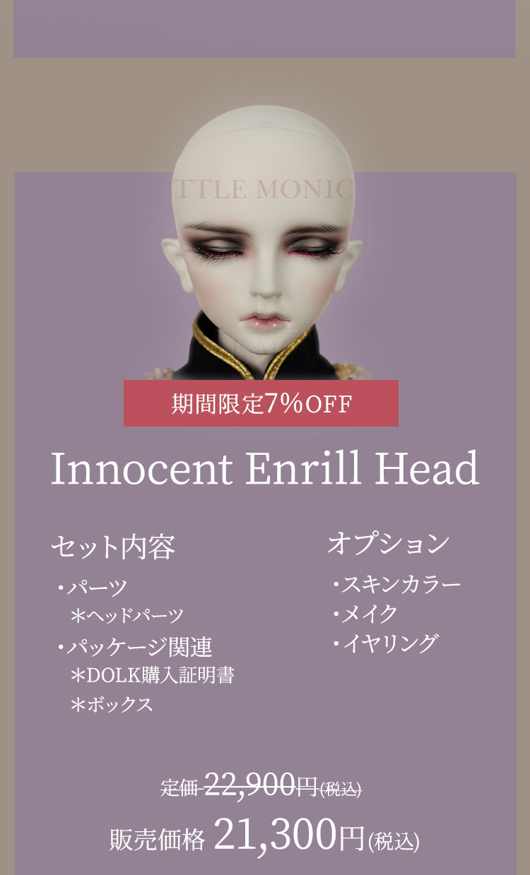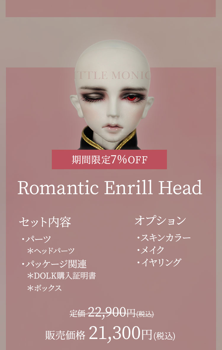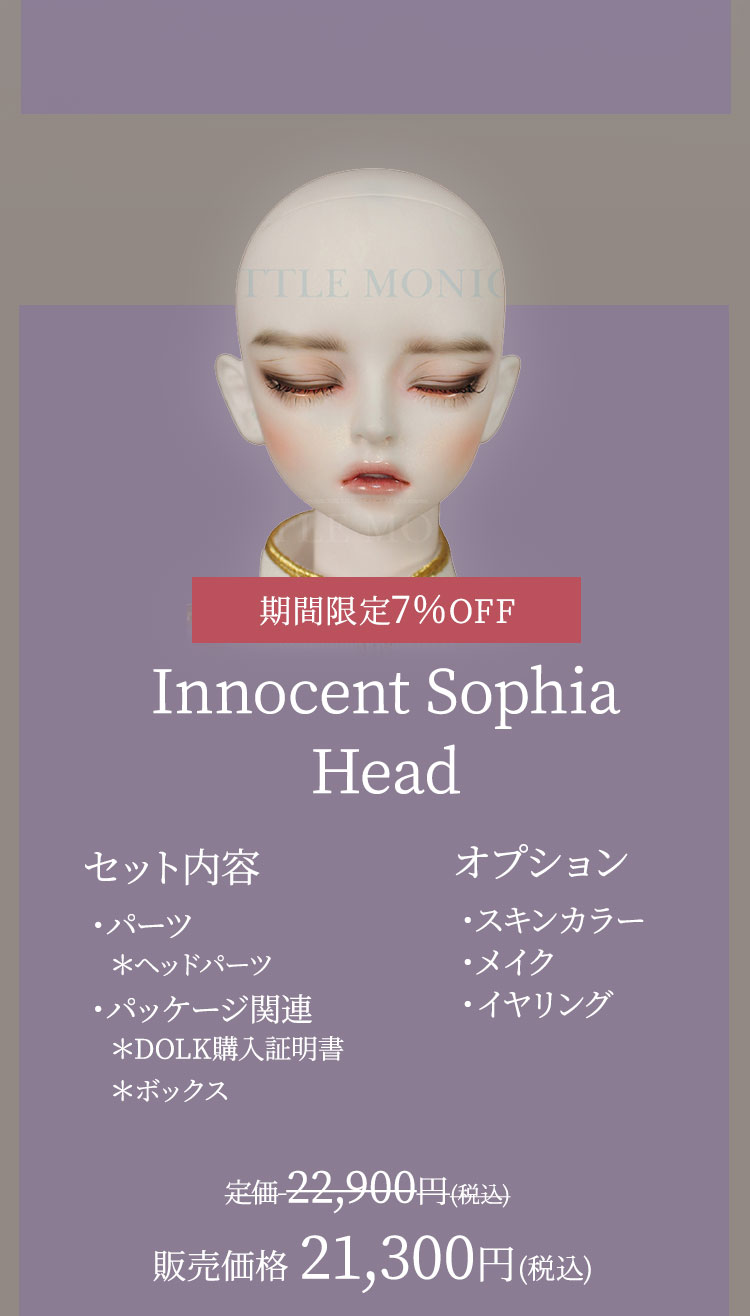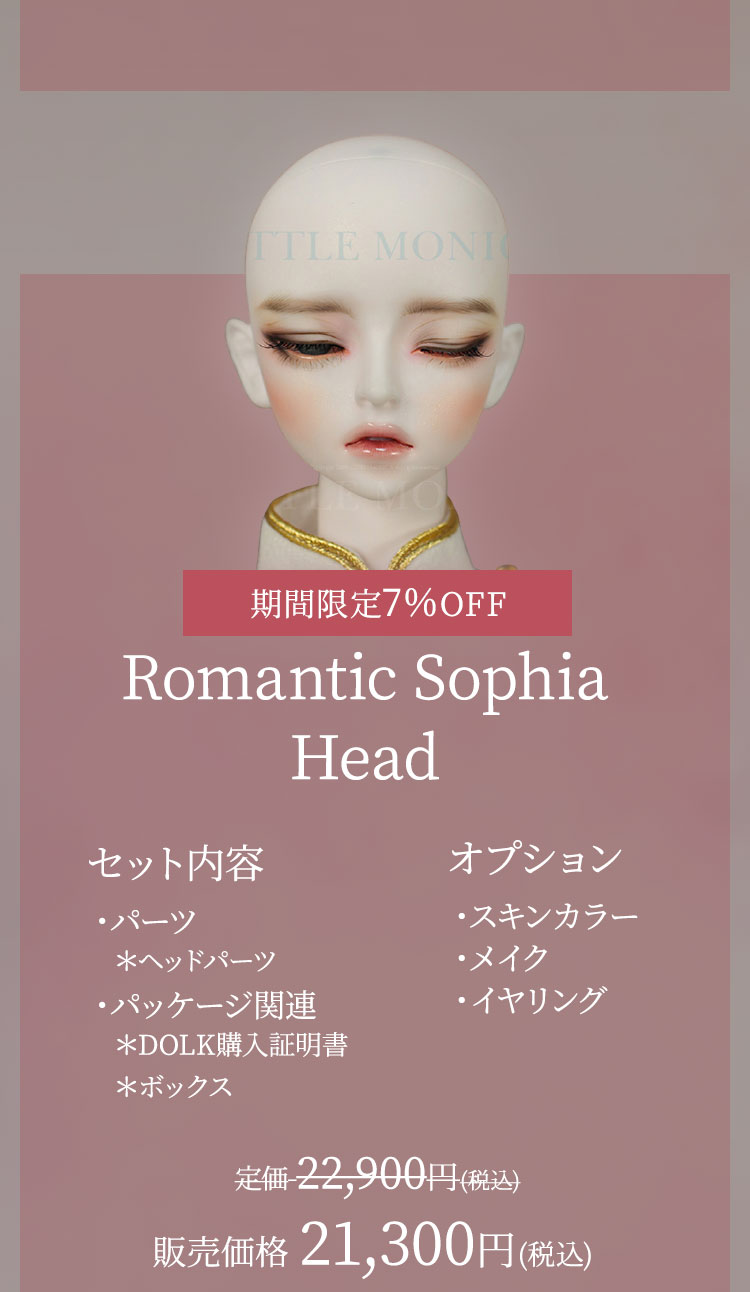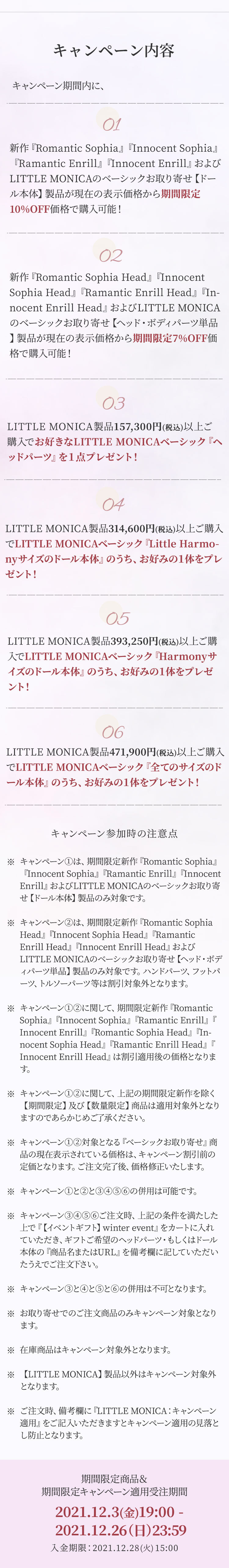 キャンペーン期間内に、 ①新作『Romantic Sophia』『Innocent Sophia』『Ramantic Enrill』『Innocent Enrill』およびLITTLE MONICAのベーシックお取り寄せ【ドール本体】製品が現在の表示価格から【期間限定10%OFF】価格で購入可能! ②新作『Romantic Sophia Head』『Innocent Sophia Head』『Ramantic Enrill Head』『Innocent Enrill Head』およびLITTLE MONICAのベーシックお取り寄せ【パーツ単品】製品が現在の表示価格から【期間限定7%OFF】価格で購入可能! ③LITTLE MONICA製品【157,300円(税込)】以上ご購入でお好きなLITTLE MONICAベーシック『ヘッドパーツ』を1点プレゼント! ④LITTLE MONICA製品【314,600円(税込)】以上ご購入でLITTLE MONICAベーシック『Little Harmonyサイズのドール本体』のうち、お好みの1体をプレゼント! ⑤LITTLE MONICA製品【393,250円(税込)】以上ご購入でLITTLE MONICAベーシック『Harmonyサイズのドール本体』のうち、お好みの1体をプレゼント! ⑥LITTLE MONICA製品【471,900円(税込)】以上ご購入でLITTLE MONICAベーシック『全てのサイズのドール本体』のうち、お好みの1体をプレゼント!