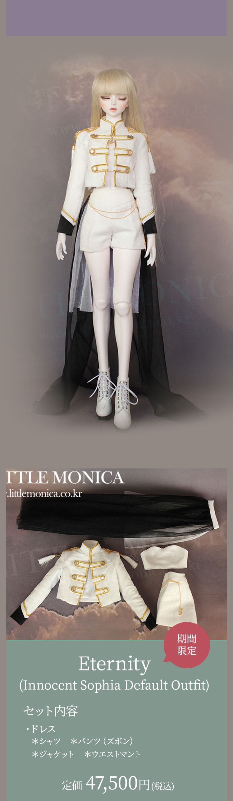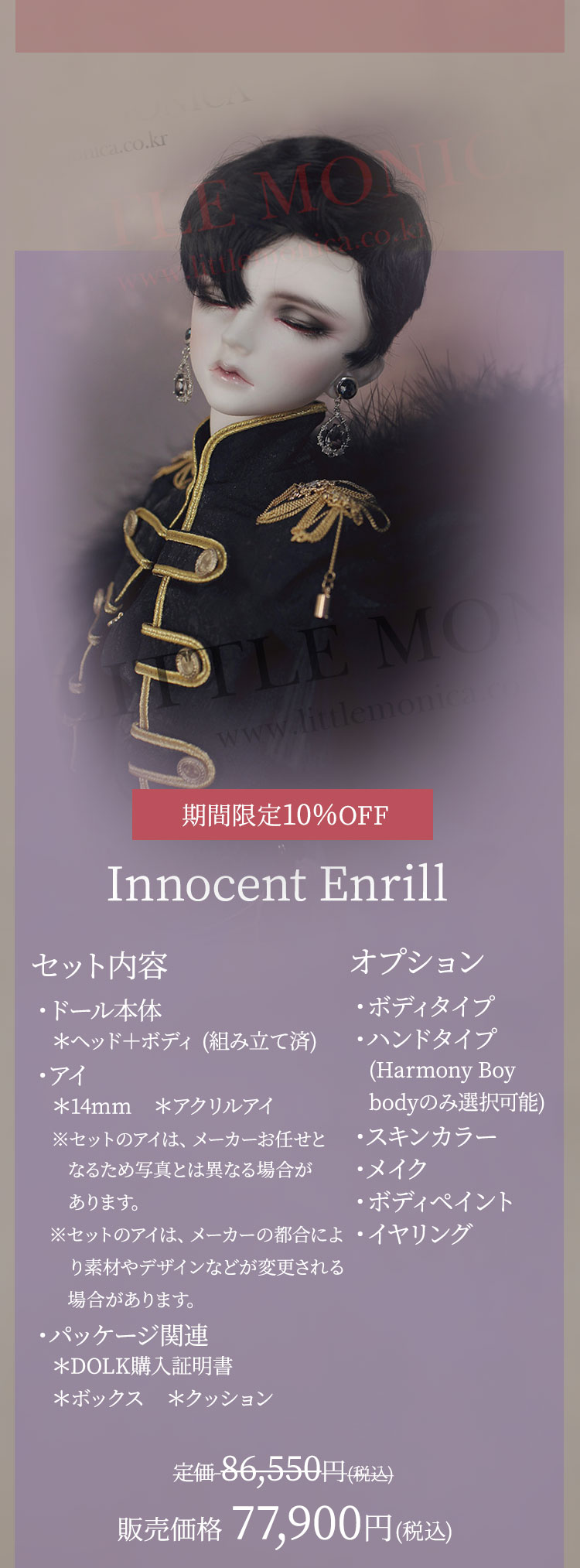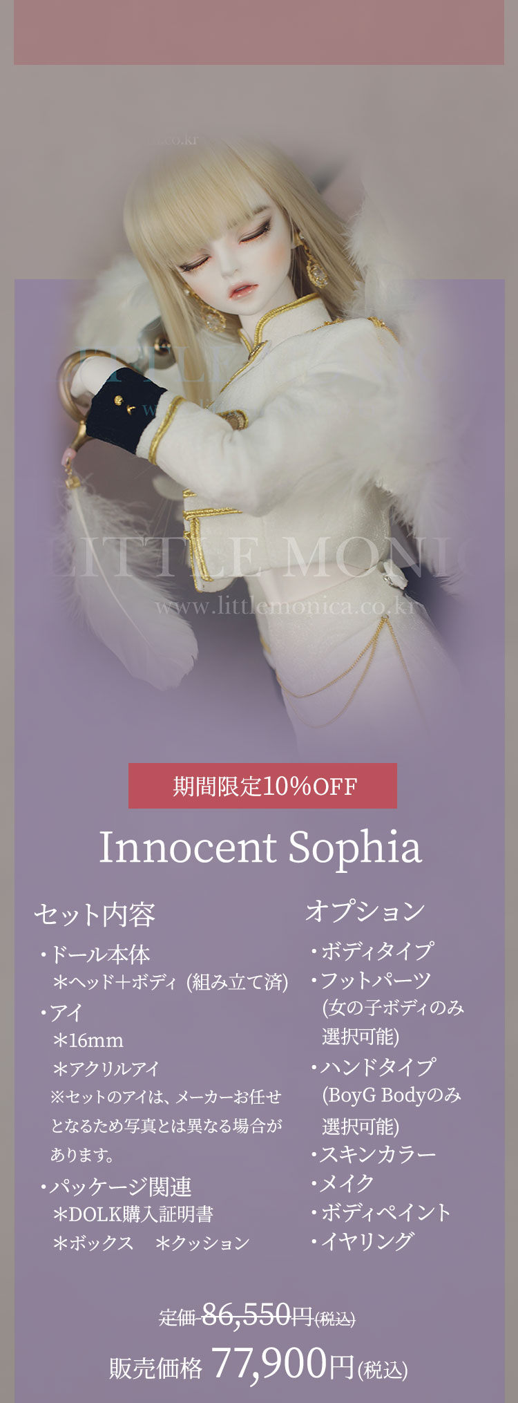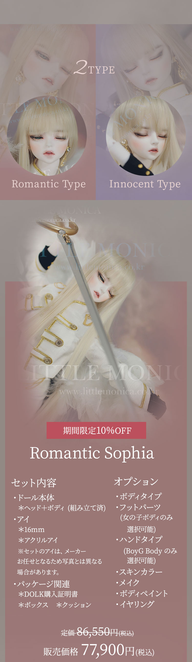 キャンペーン期間内に、 ①新作『Romantic Sophia』『Innocent Sophia』『Ramantic Enrill』『Innocent Enrill』およびLITTLE MONICAのベーシックお取り寄せ【ドール本体】製品が現在の表示価格から【期間限定10%OFF】価格で購入可能! ②新作『Romantic Sophia Head』『Innocent Sophia Head』『Ramantic Enrill Head』『Innocent Enrill Head』およびLITTLE MONICAのベーシックお取り寄せ【パーツ単品】製品が現在の表示価格から【期間限定7%OFF】価格で購入可能! ③LITTLE MONICA製品【157,300円(税込)】以上ご購入でお好きなLITTLE MONICAベーシック『ヘッドパーツ』を1点プレゼント! ④LITTLE MONICA製品【314,600円(税込)】以上ご購入でLITTLE MONICAベーシック『Little Harmonyサイズのドール本体』のうち、お好みの1体をプレゼント! ⑤LITTLE MONICA製品【393,250円(税込)】以上ご購入でLITTLE MONICAベーシック『Harmonyサイズのドール本体』のうち、お好みの1体をプレゼント! ⑥LITTLE MONICA製品【471,900円(税込)】以上ご購入でLITTLE MONICAベーシック『全てのサイズのドール本体』のうち、お好みの1体をプレゼント!