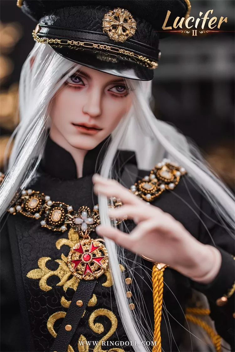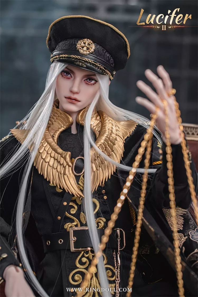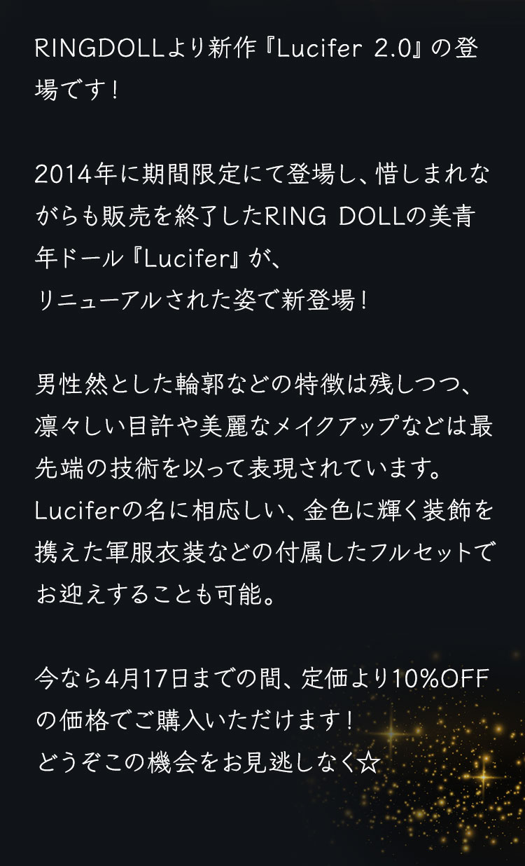 2014年に期間限定にて登場し、惜しまれながらも販売を終了したRING DOLLの美青年ドール『Lucifer』が、リニューアルされた姿で新登場! 男性然とした輪郭などの特徴は残しつつ、凛々しい目許や美麗なメイクアップなどは最先端の技術を以って表現されています。 Luciferの名に相応しい、金色に輝く装飾を携えた軍服衣装などの付属したフルセットでお迎えすることも可能。 今なら4月17日までの間、定価より10%OFFの価格でご購入いただけます! どうぞこの機会をお見逃しなく☆