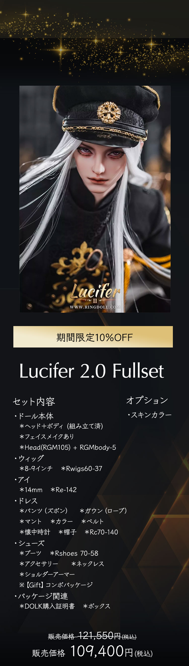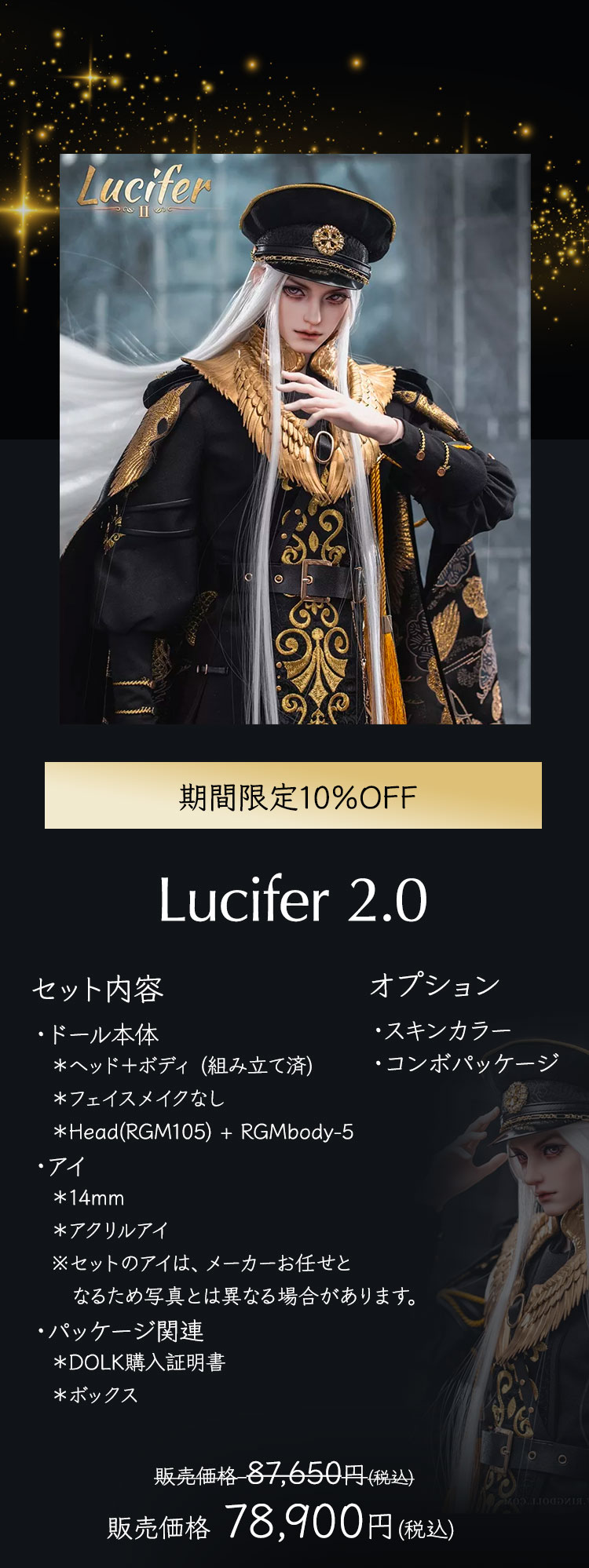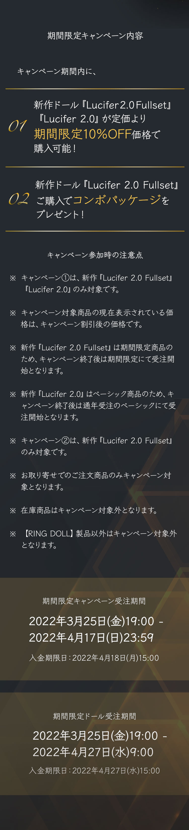 キャンペーン期間内に、 ①新作ドール『Lucifer 2.0 Fullset』『Lucifer 2.0』が定価より【期間限定10%OFF】価格で購入可能! ②新作ドール『Lucifer 2.0 Fullset』ご購入で【コンボパッケージ】をプレゼント!