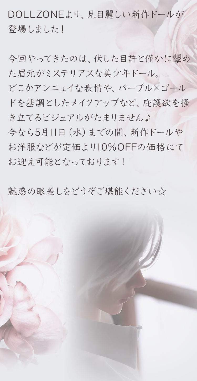 今回やってきたのは、伏した目許と僅かに顰めた眉元がミステリアスな美少年ドール。 どこかアンニュイな表情や、パープル×ゴールドを基調としたメイクアップなど、庇護欲を掻き立てるビジュアルがたまりません♪ 今なら5月11日(水)までの間、新作ドールやお洋服などが定価より10%OFFの価格にてお迎え可能となっております! 魅惑の眼差しをどうぞご堪能ください☆