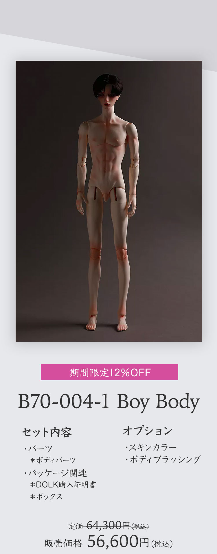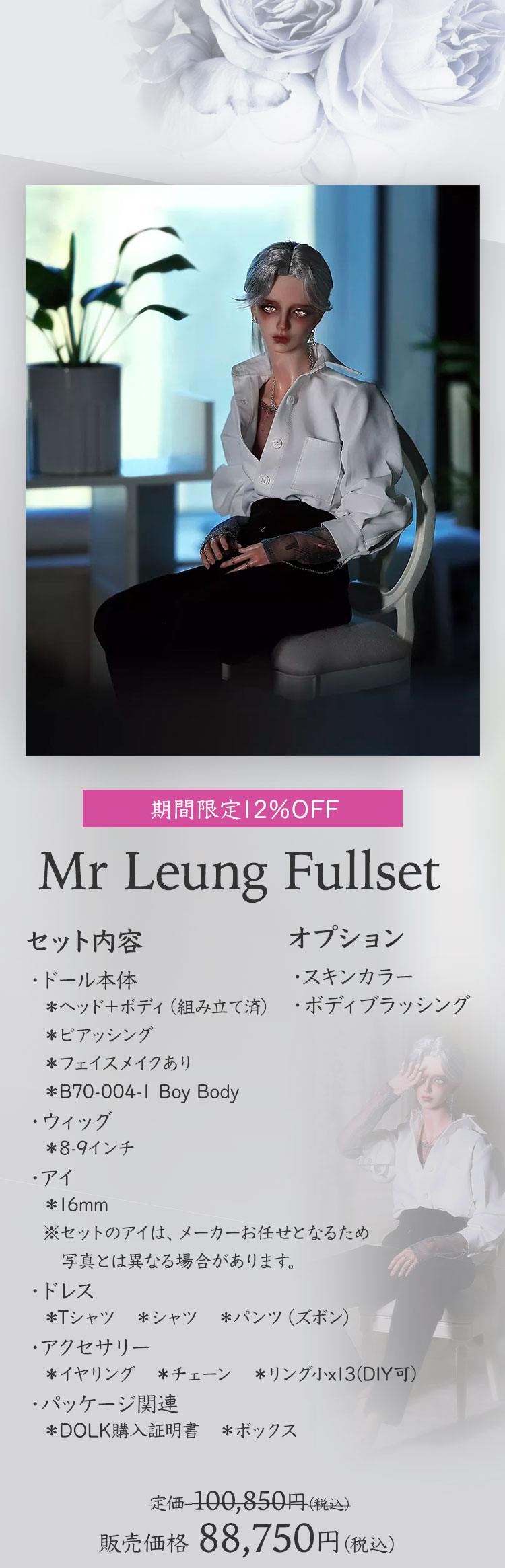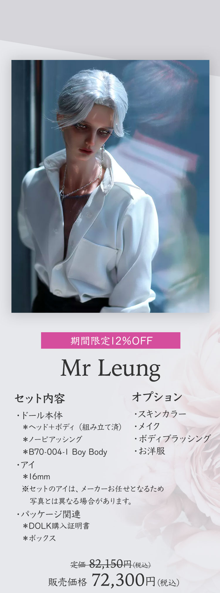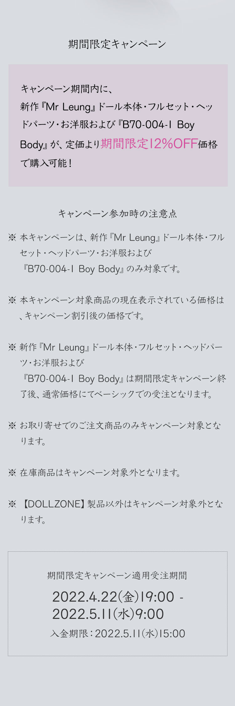 キャンペーン期間内に、 新作『Mr Leung』ドール本体・フルセット・ヘッドパーツ・お洋服および 『B70-004-1 Boy Body』が定価より【期間限定12%OFF】価格で購入可能!