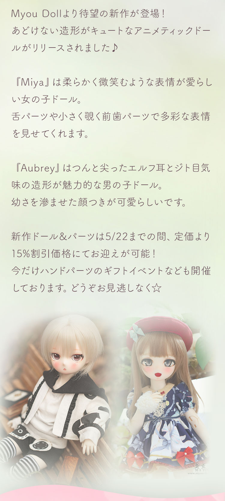 あどけない造形がキュートなアニメティックドールがリリースされました♪ 『Miya』は柔らかく微笑むような表情が愛らしい女の子ドール。舌パーツや小さく覗く前歯パーツで多彩な表情を見せてくれます。 『Aubrey』はつんと尖ったエルフ耳とジト目気味の造形が魅力的な男の子ドール。幼さを滲ませた顔つきが可愛らしいです。 新作ドール&パーツは5/22までの間、定価より15%割引価格にてお迎えが可能! 今だけハンドパーツのギフトイベントなども開催しております。どうぞお見逃しなく☆
