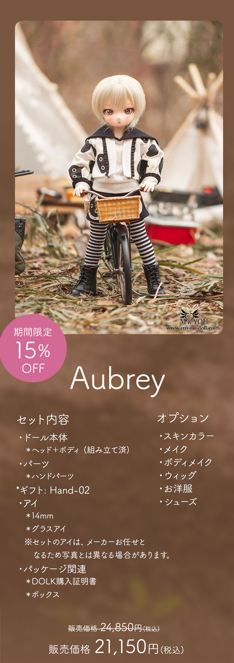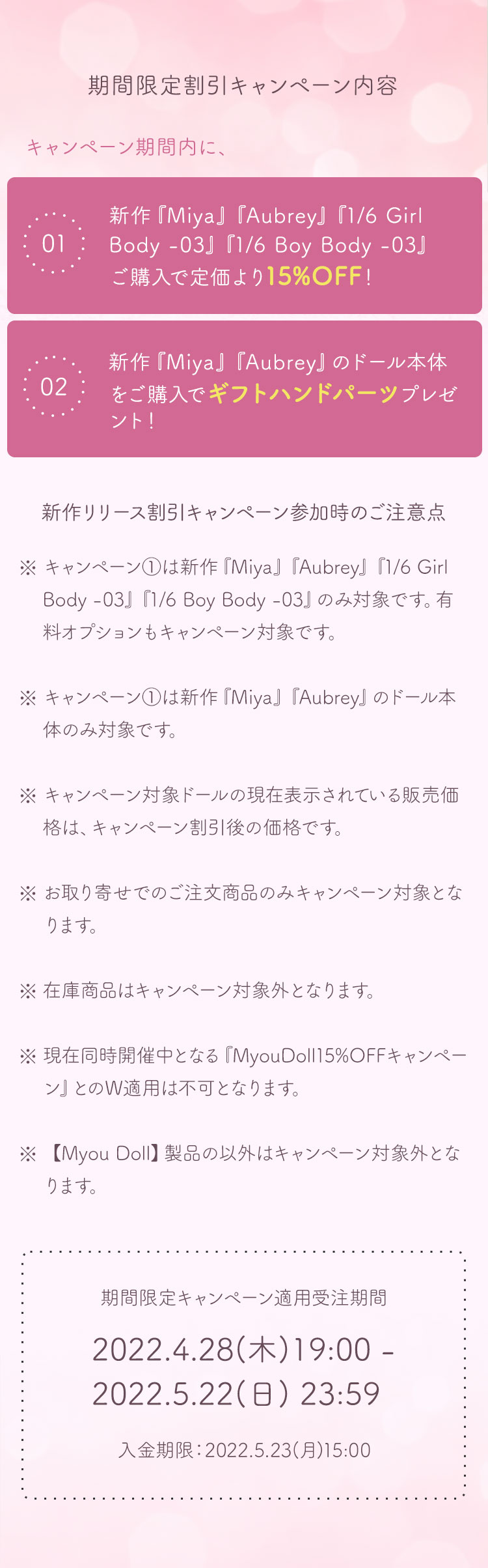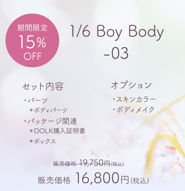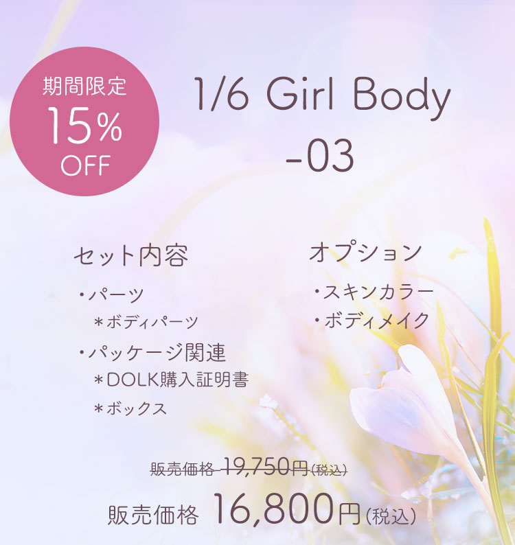 キャンペーン期間内に、 ①新作『Miya』『Aubrey』『1/6 Girl Body -03』『1/6 Boy Body -03』ご購入で定価より【15%OFF】! ②新作『Miya』『Aubrey』のドール本体をご購入で【ギフトハンドパーツ】プレゼント!