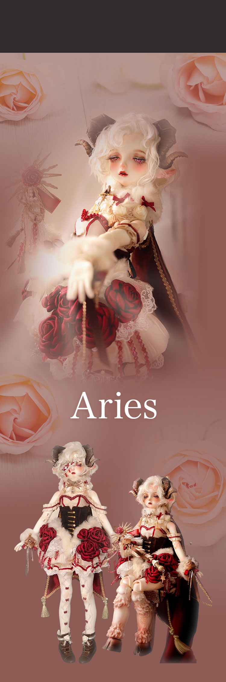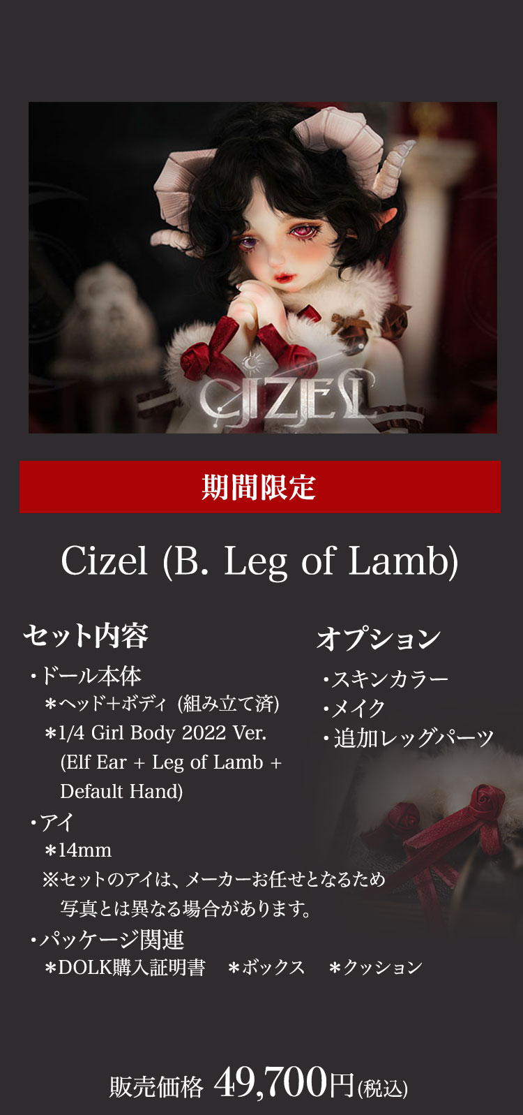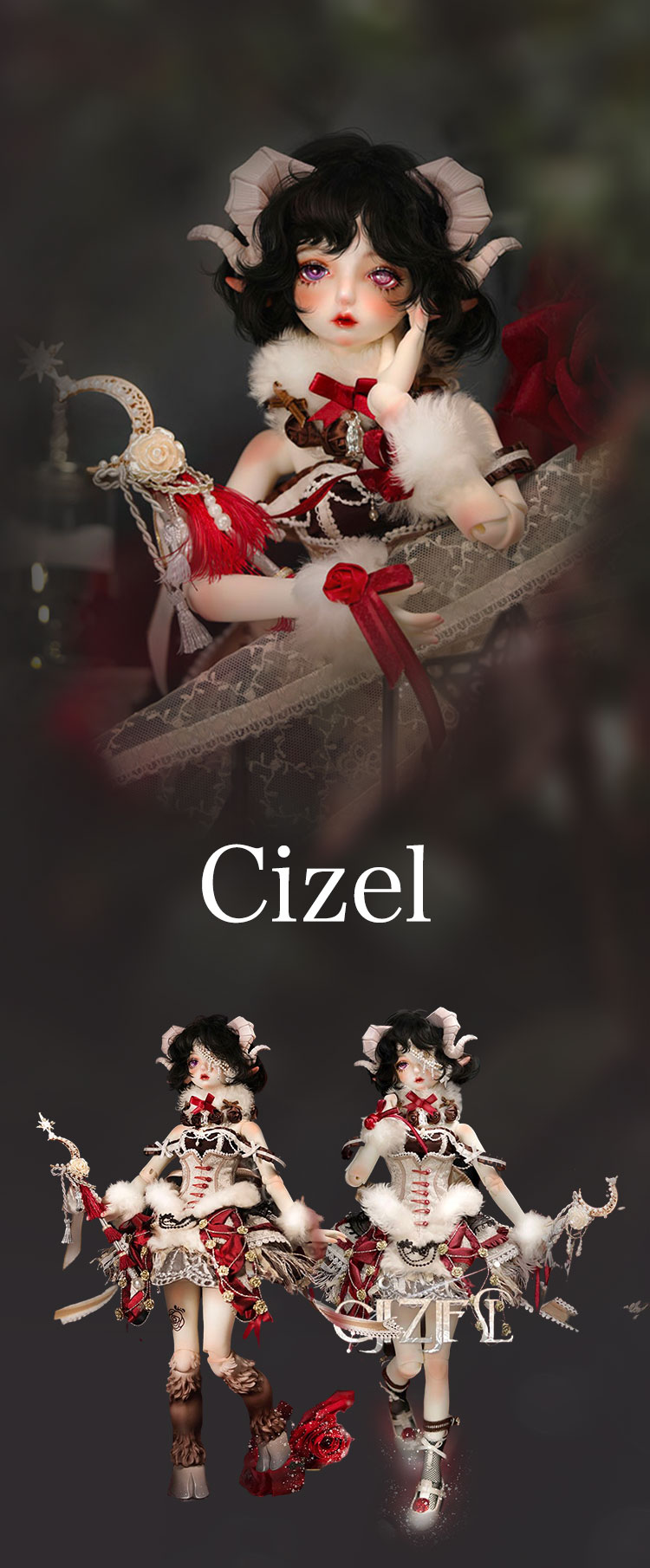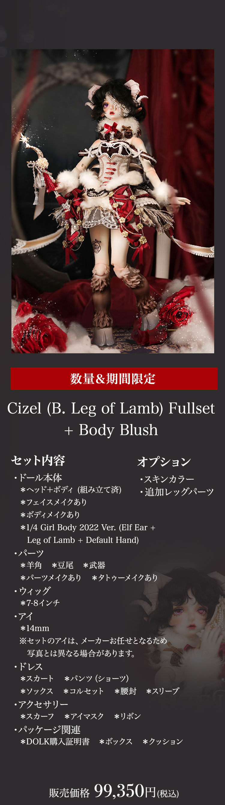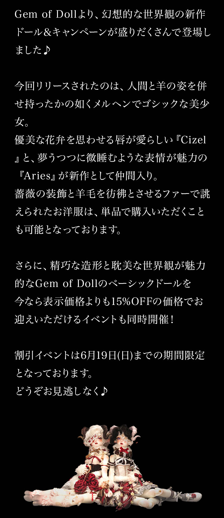 今回リリースされたのは、人間と羊の姿を併せ持ったかの如くメルヘンでゴシックな美少女。 優美な花弁を思わせる唇が愛らしい『Cizel』と、夢うつつに微睡むような表情が魅力の『Aries』が新作として仲間入り。 薔薇の装飾と羊毛を彷彿とさせるファーで誂えられたお洋服は、単品で購入いただくことも可能となっております。 さらに、精巧な造形と耽美な世界観が魅力的なGem of Dollのベーシックドールを今なら表示価格よりも15%OFFの価格でお迎えいただけるイベントも同時開催! 割引イベントは6月19日(日)までの期間限定となっております。 どうぞお見逃しなく♪