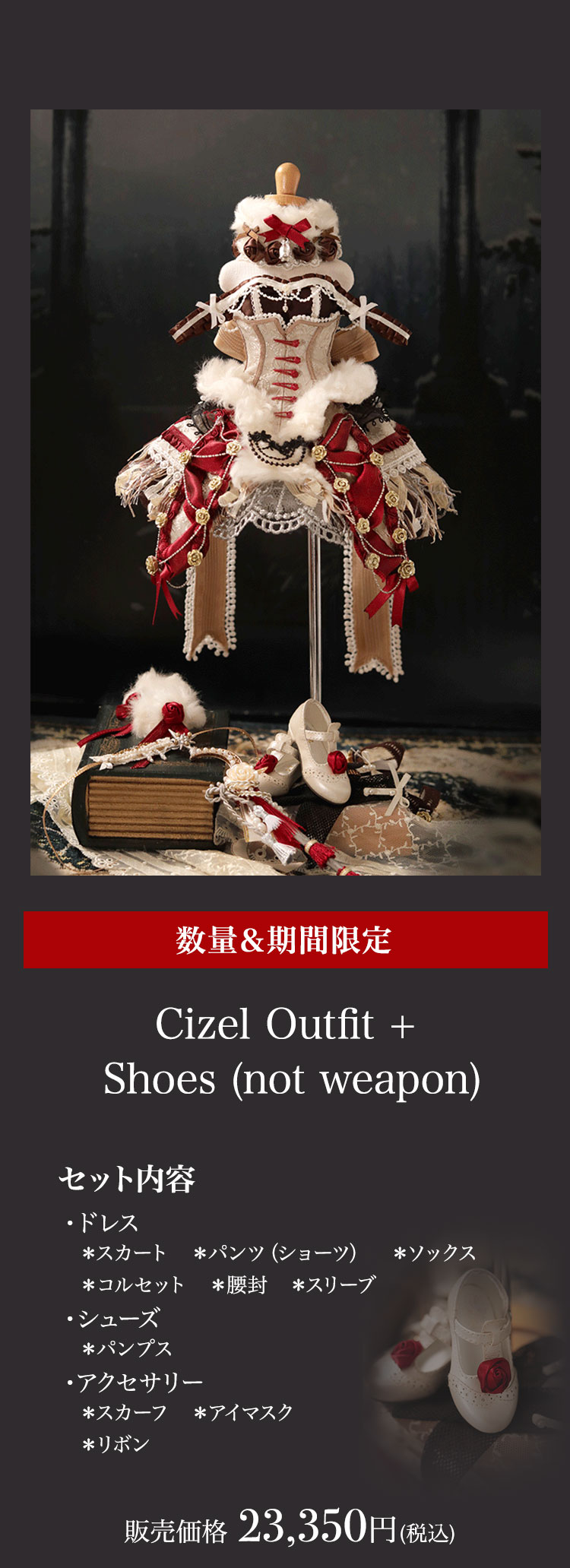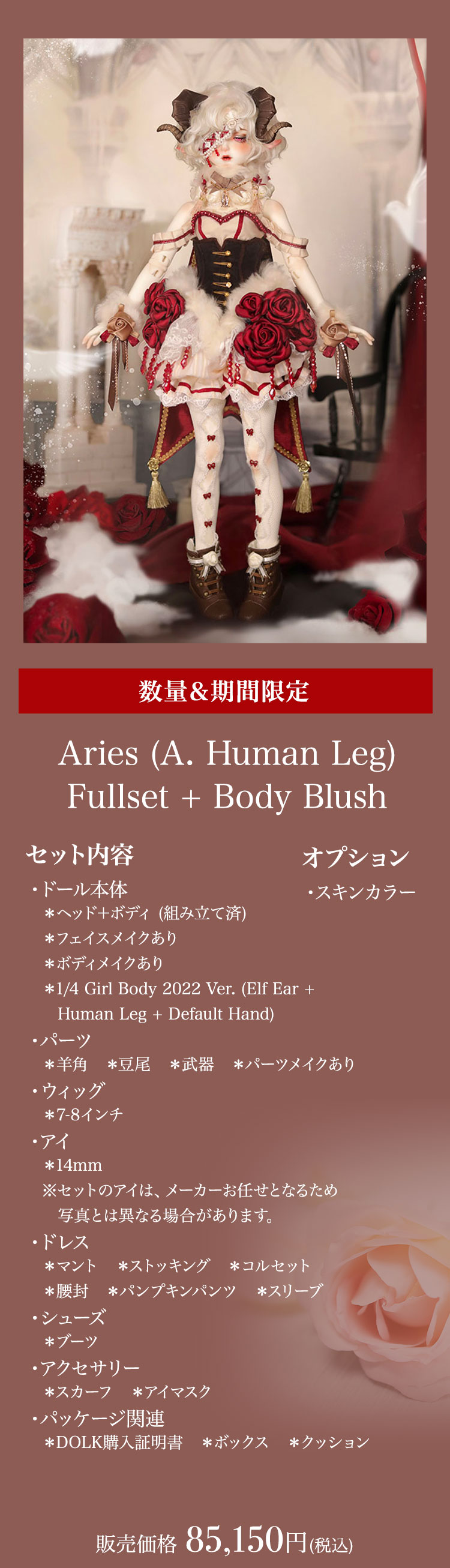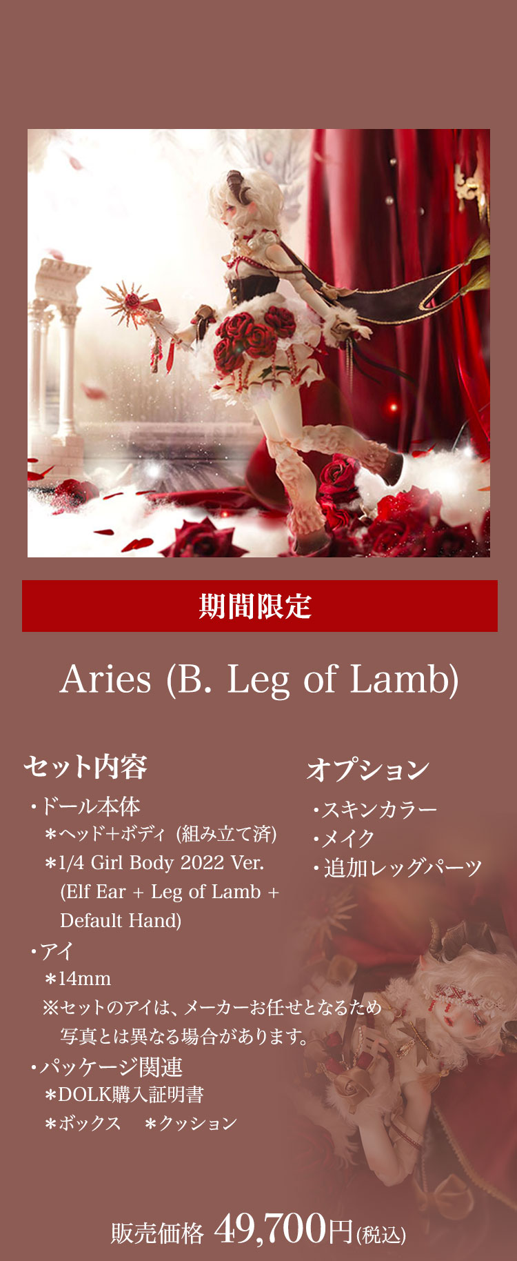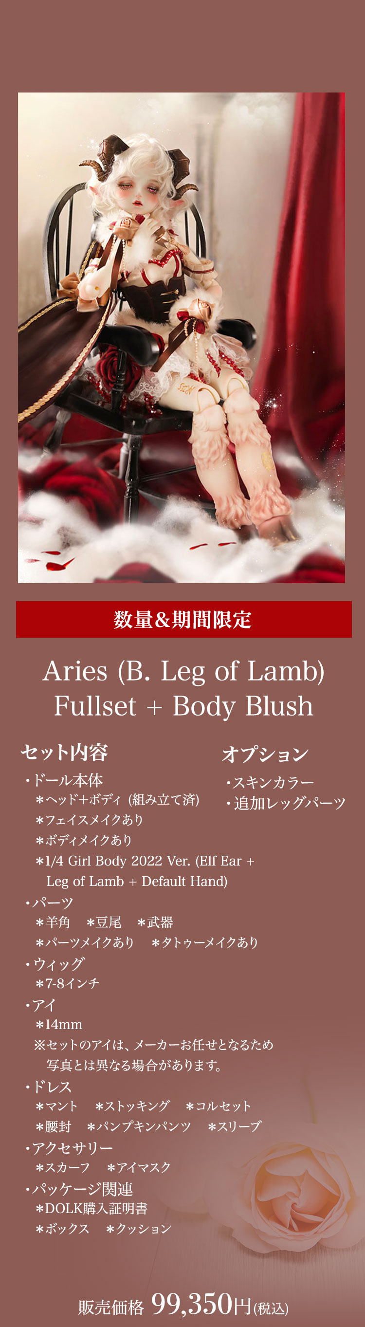 今回リリースされたのは、人間と羊の姿を併せ持ったかの如くメルヘンでゴシックな美少女。 優美な花弁を思わせる唇が愛らしい『Cizel』と、夢うつつに微睡むような表情が魅力の『Aries』が新作として仲間入り。 薔薇の装飾と羊毛を彷彿とさせるファーで誂えられたお洋服は、単品で購入いただくことも可能となっております。 さらに、精巧な造形と耽美な世界観が魅力的なGem of Dollのベーシックドールを今なら表示価格よりも15%OFFの価格でお迎えいただけるイベントも同時開催! 割引イベントは6月19日(日)までの期間限定となっております。 どうぞお見逃しなく♪