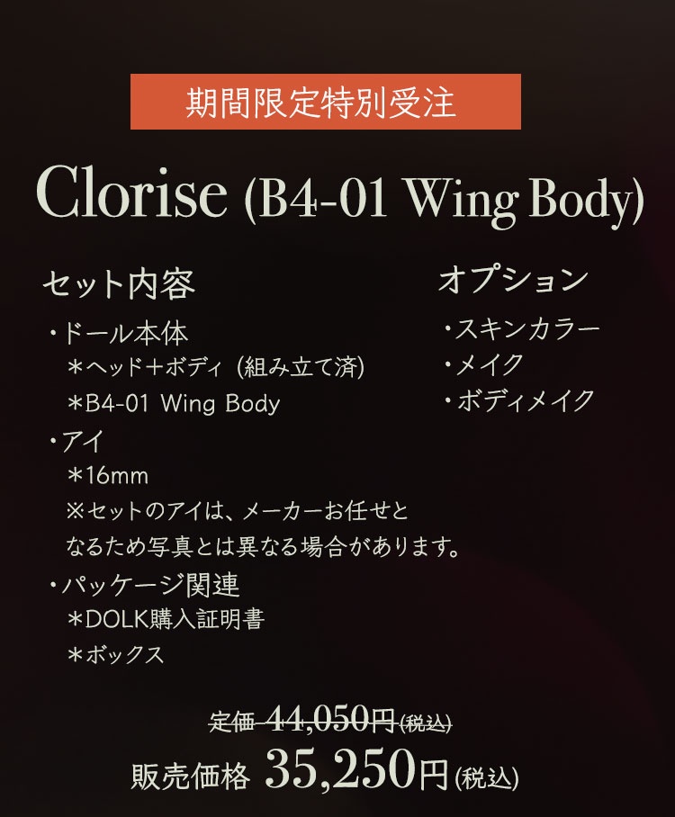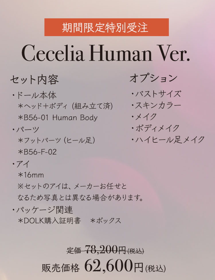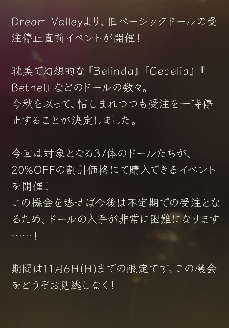 耽美で幻想的な『Belinda』『Cecelia』『Bethel』などのドールの数々。 今秋を以って、惜しまれつつも受注を一時停止することが決定しました。 今回は対象となる37体のドールたちが、20%OFFの割引価格にて購入できるイベントを開催! この機会を逃せば今後は不定期での受注となるため、ドールの入手が非常に困難になります……! 期間は11月6日(日)までの限定です。この機会をどうぞお見逃しなく!