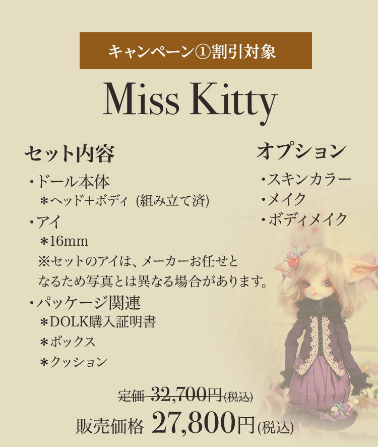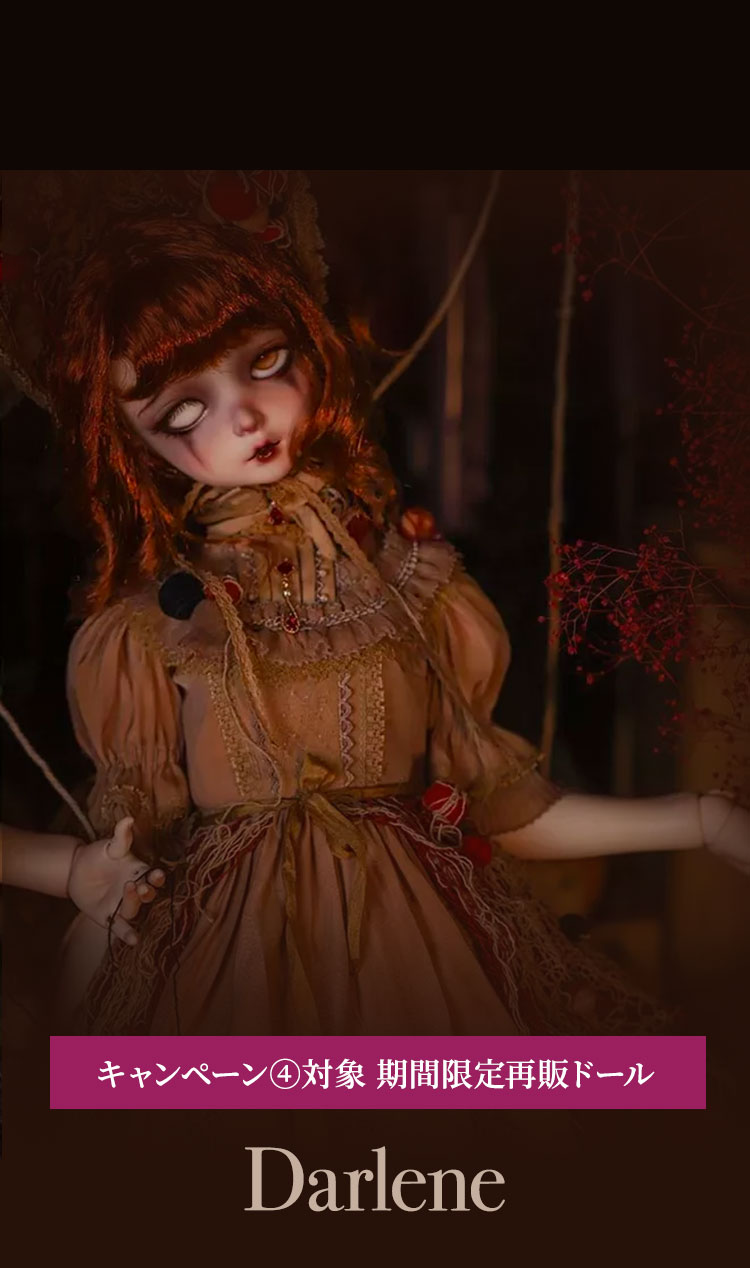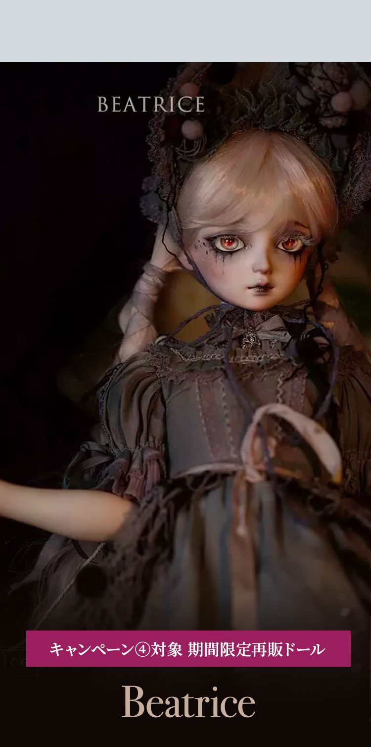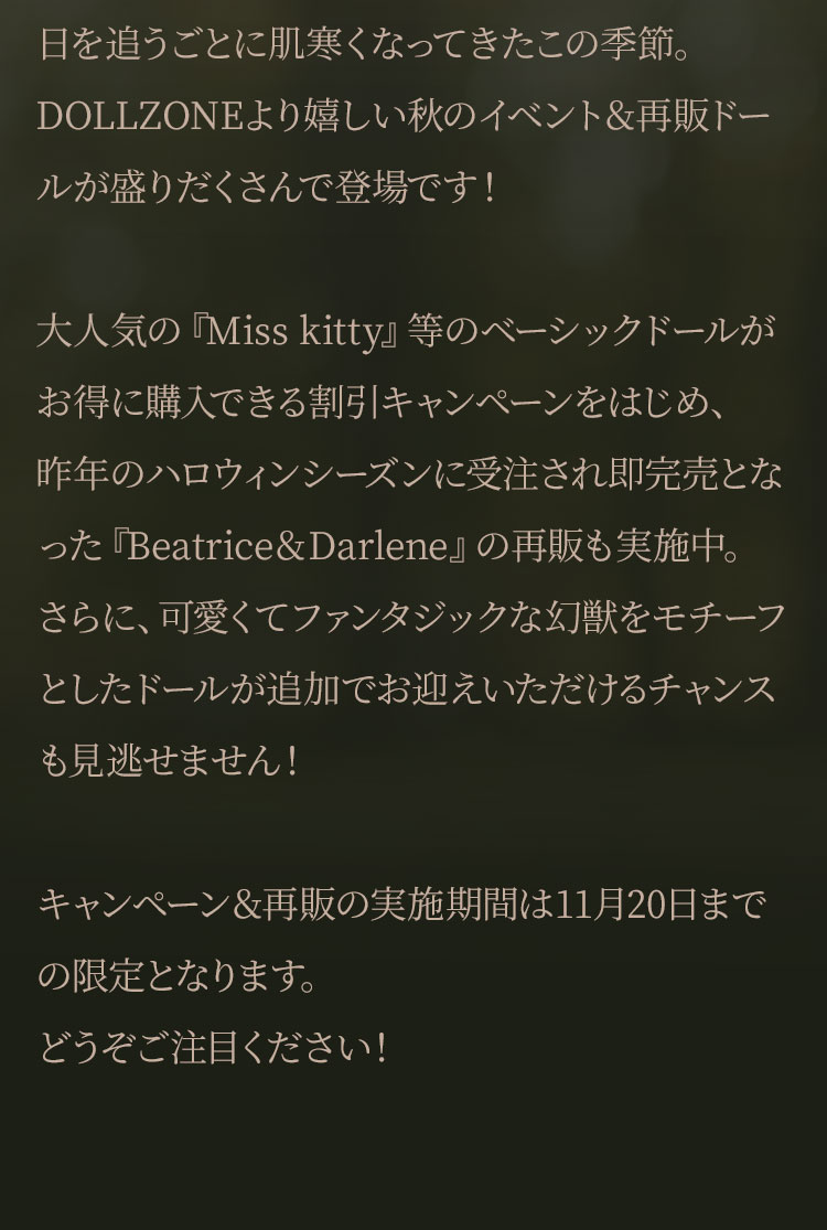 日を追うごとに肌寒くなってきたこの季節。 DOLLZONEより嬉しい秋のイベント&再販ドールが盛りだくさんで登場です! 大人気の『Miss kitty』等のベーシックドールがお得に購入できる割引キャンペーンをはじめ、 昨年のハロウィンシーズンに受注され即完売となった『Beatrice&Darlene』の再販も実施中。 さらに、可愛くてファンタジックな幻獣をモチーフとしたドールが追加でお迎えいただけるチャンスも見逃せません! キャンペーン&再販の実施期間は11月20日までの限定となります。 どうぞご注目ください!