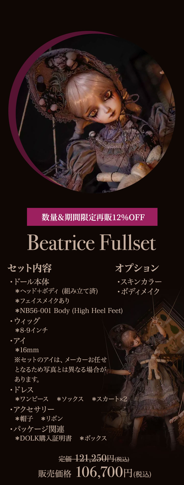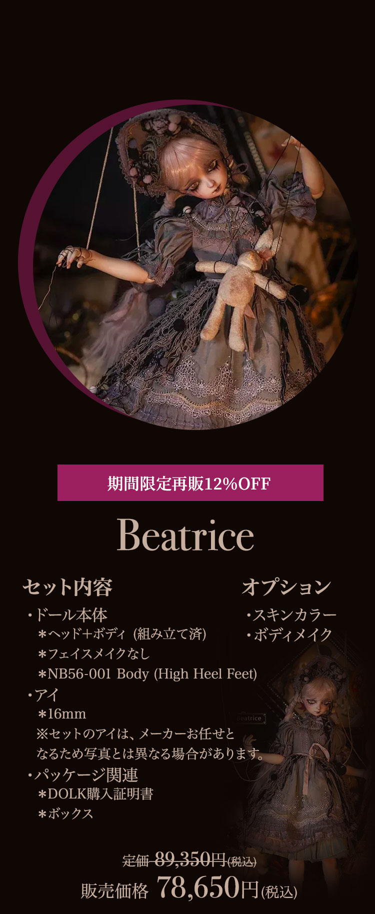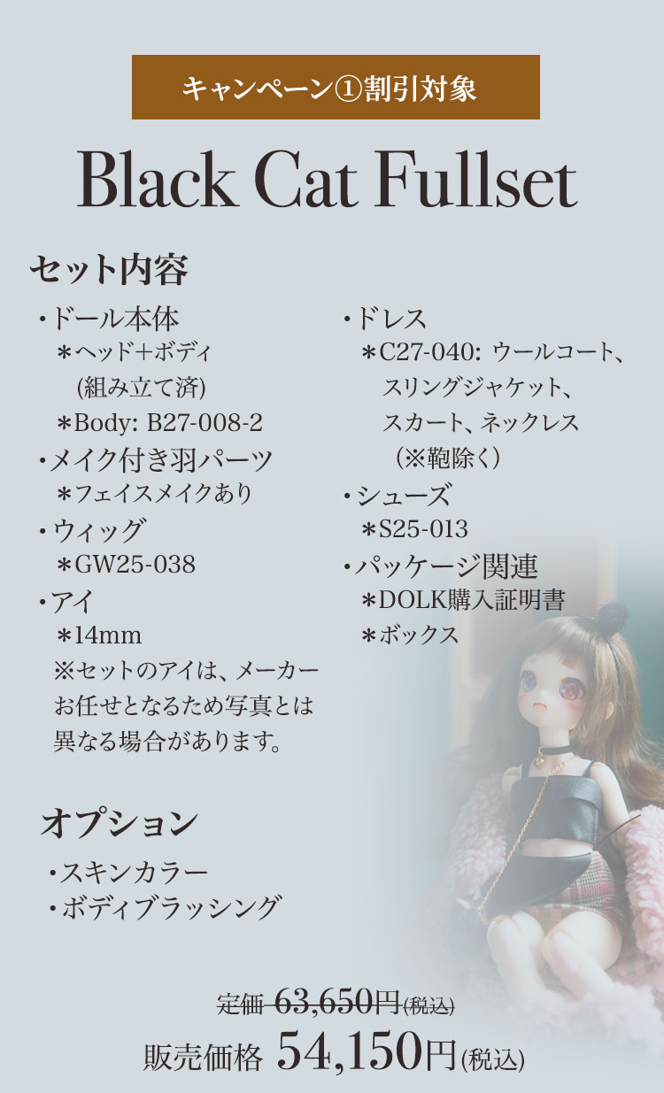 日を追うごとに肌寒くなってきたこの季節。 DOLLZONEより嬉しい秋のイベント&再販ドールが盛りだくさんで登場です! 大人気の『Miss kitty』等のベーシックドールがお得に購入できる割引キャンペーンをはじめ、 昨年のハロウィンシーズンに受注され即完売となった『Beatrice&Darlene』の再販も実施中。 さらに、可愛くてファンタジックな幻獣をモチーフとしたドールが追加でお迎えいただけるチャンスも見逃せません! キャンペーン&再販の実施期間は11月20日までの限定となります。 どうぞご注目ください!
