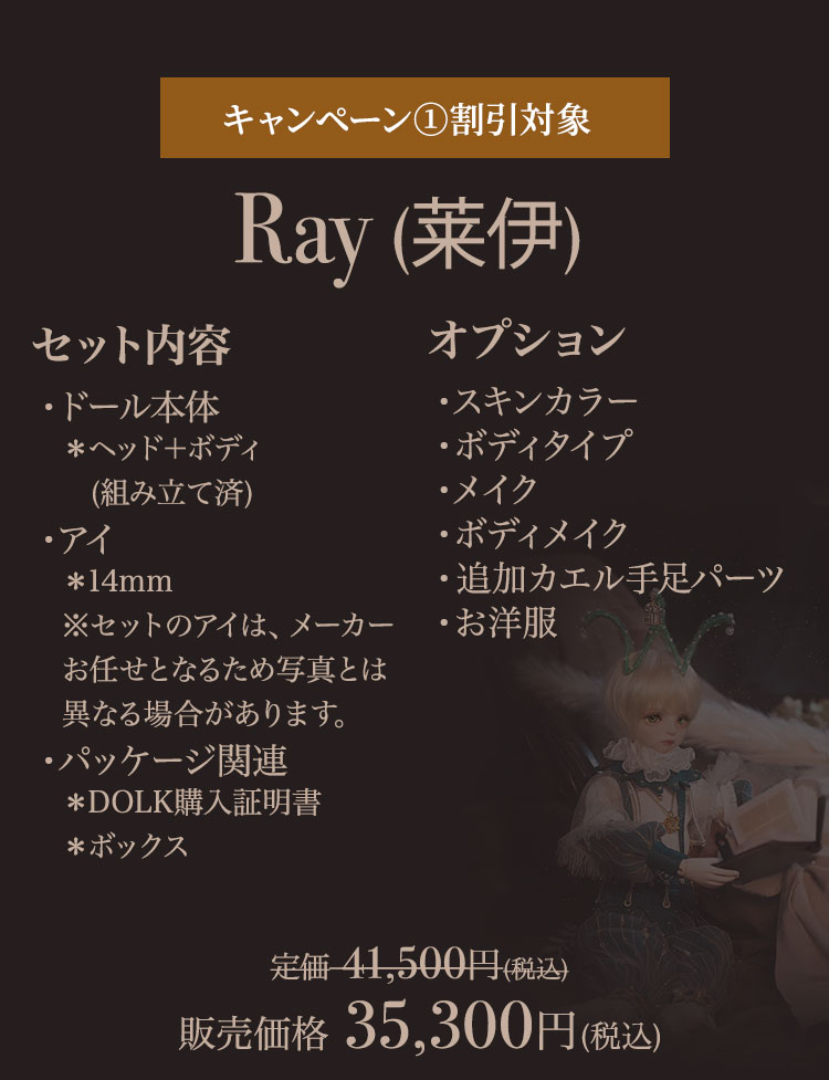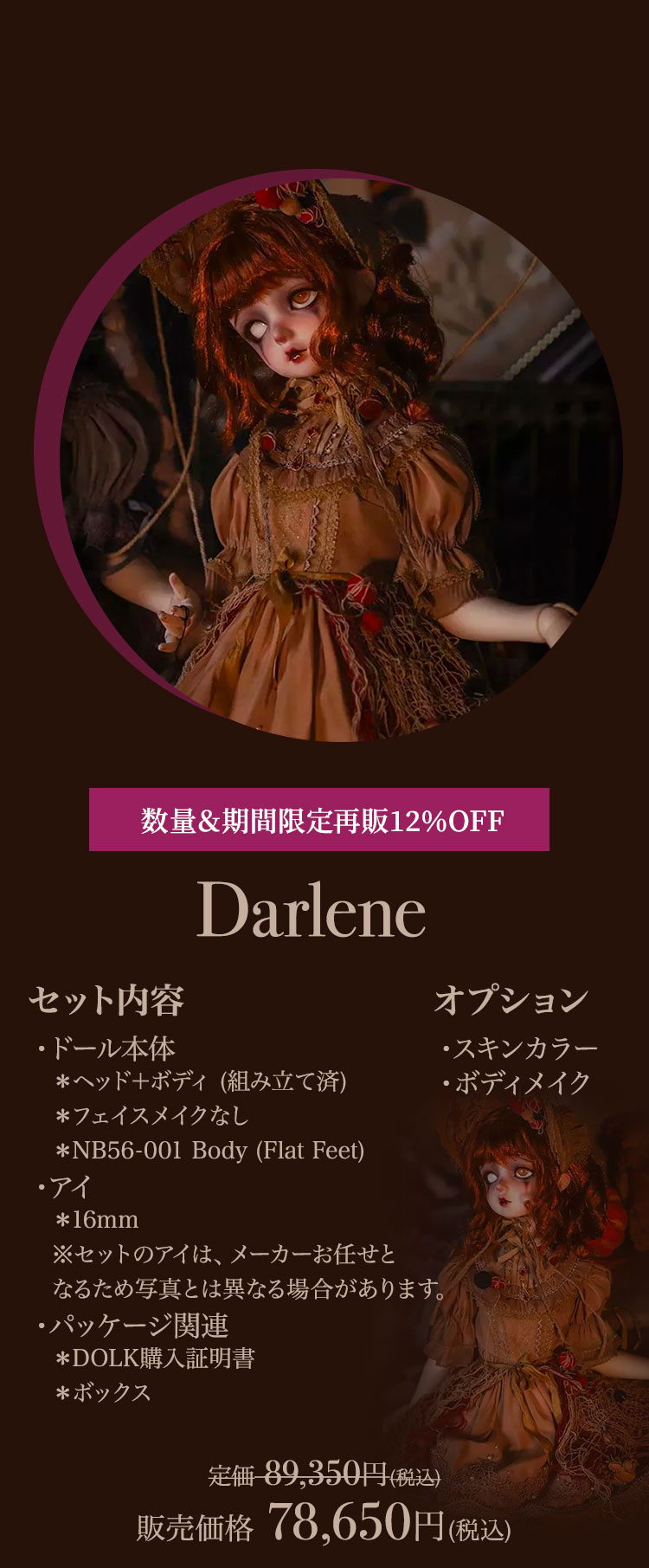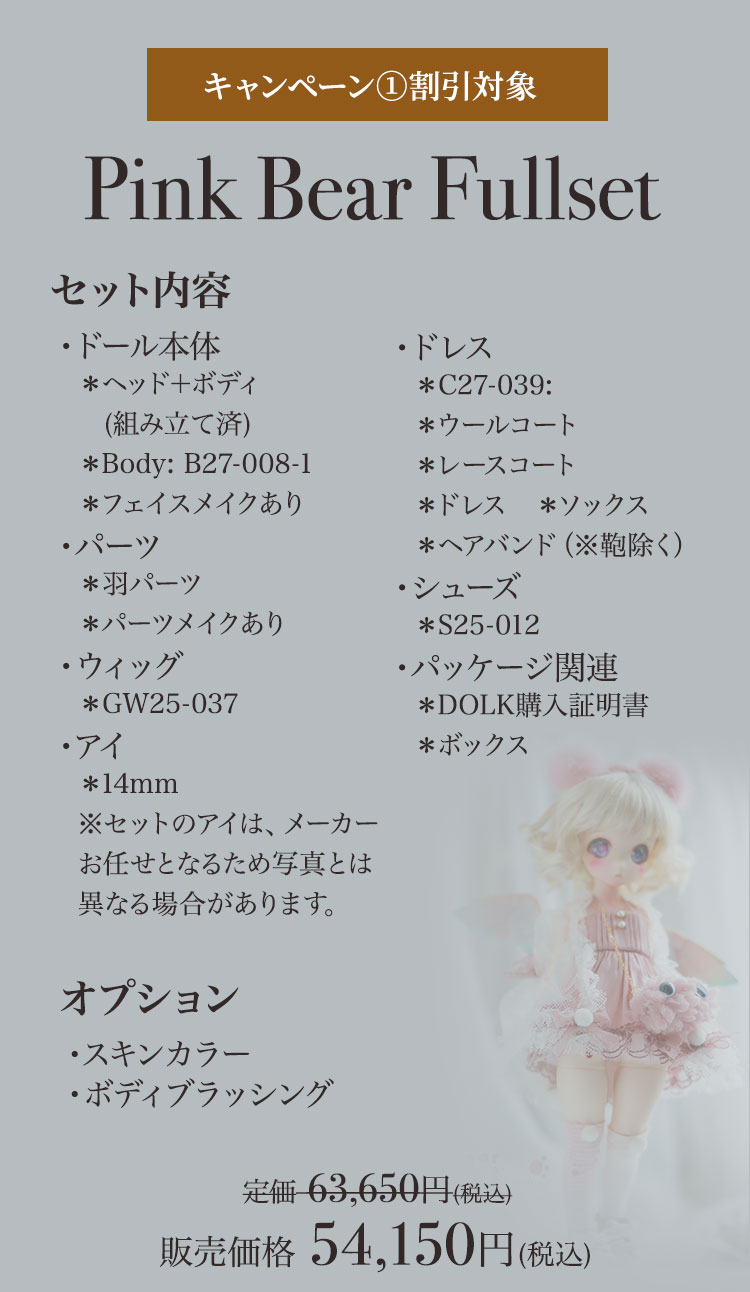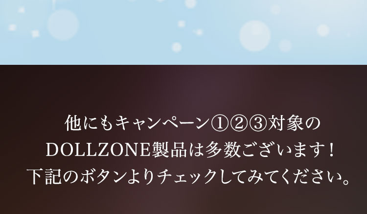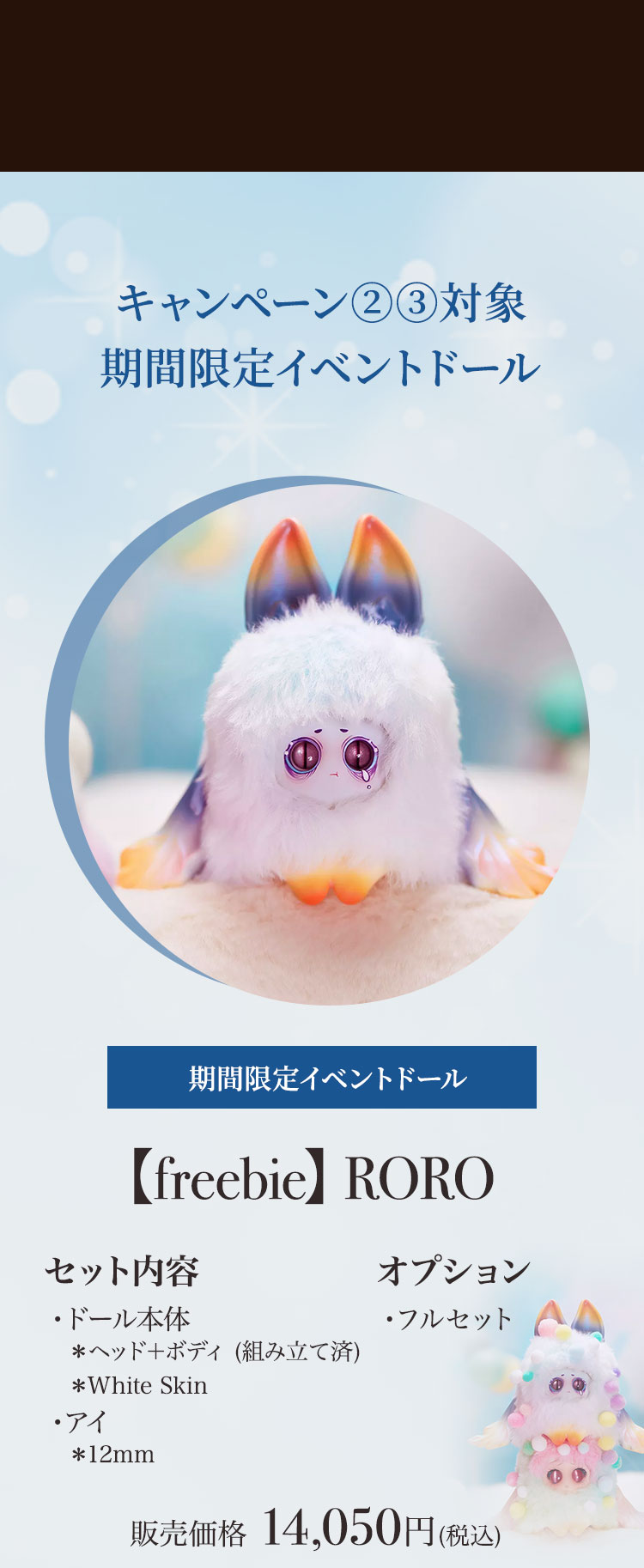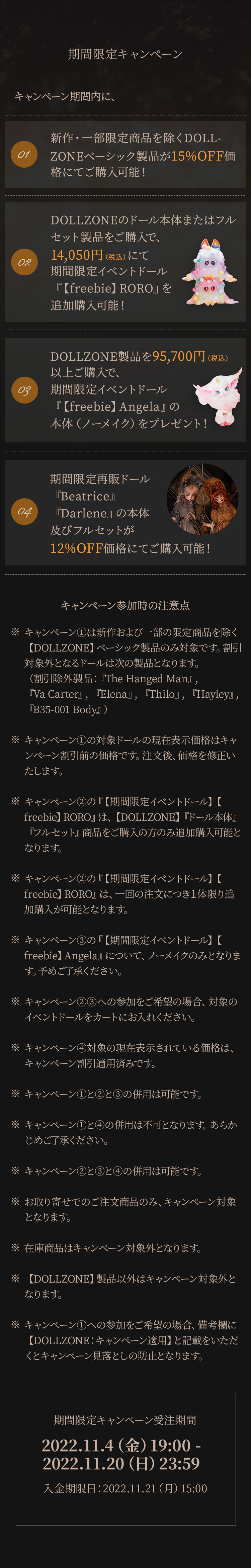 キャンペーン期間内に ①新作・一部限定商品を除くDOLLZONEベーシック製品が【15%OFF】価格にてご購入可能! ②DOLLZONEのドール本体またはフルセット製品をご購入で、【14,050円(税込)】にて期間限定イベントドール『【freebie】RORO』を追加購入可能! ③DOLLZONE製品を【95,700円(税込)】以上ご購入で、期間限定イベントドール『【freebie】Angela』の本体(ノーメイク)をプレゼント! ④期間限定再販ドール『Beatrice』『Darlene』の本体及びフルセットが【12%OFF】価格にてご購入可能!