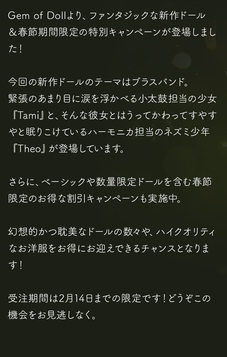 今回の新作ドールのテーマはブラスバンド。緊張のあまり目に涙を浮かべる小太鼓担当の少女『Tami』と、そんな彼女とはうってかわってすやすやと眠りこけているハーモニカ担当のネズミ少年『Theo』が登場しています。さらに、ベーシックや数量限定ドールを含む春節限定のお得な割引キャンペーンも実施中。 幻想的かつ耽美なドールの数々や、ハイクオリティなお洋服をお得にお迎えできるチャンスとなります! 受注期間は2月14日までの限定です!どうぞこの機会をお見逃しなく。