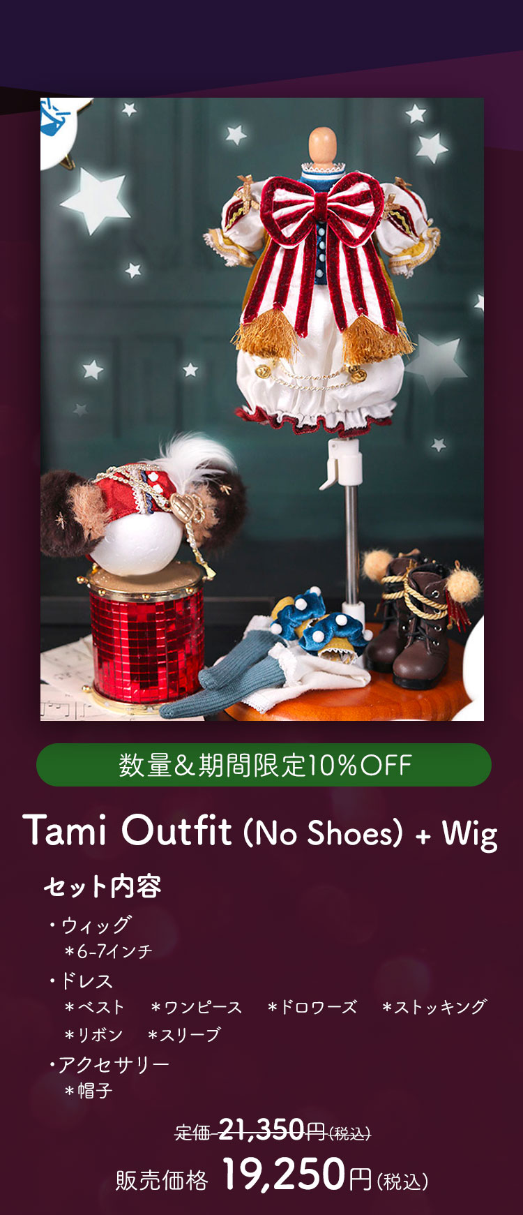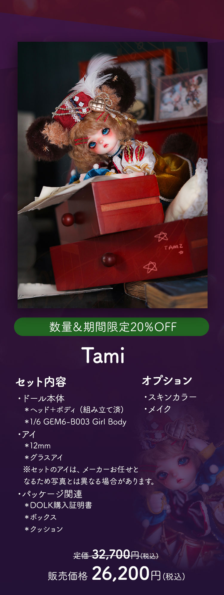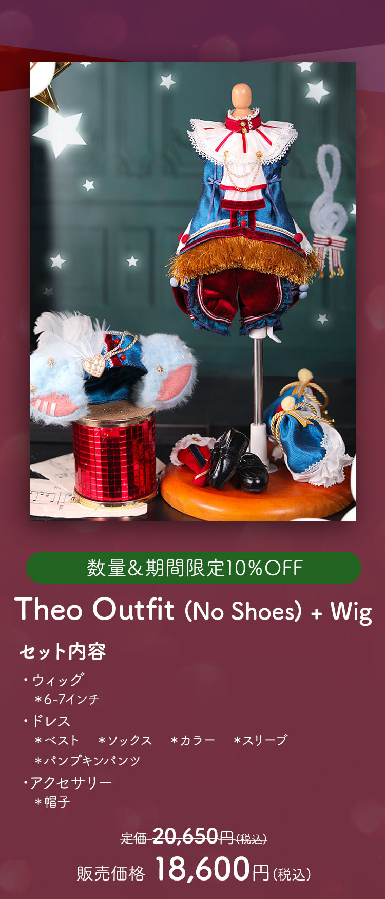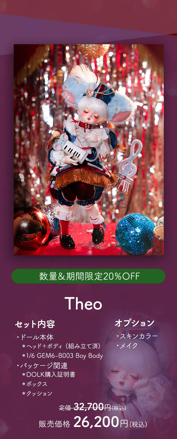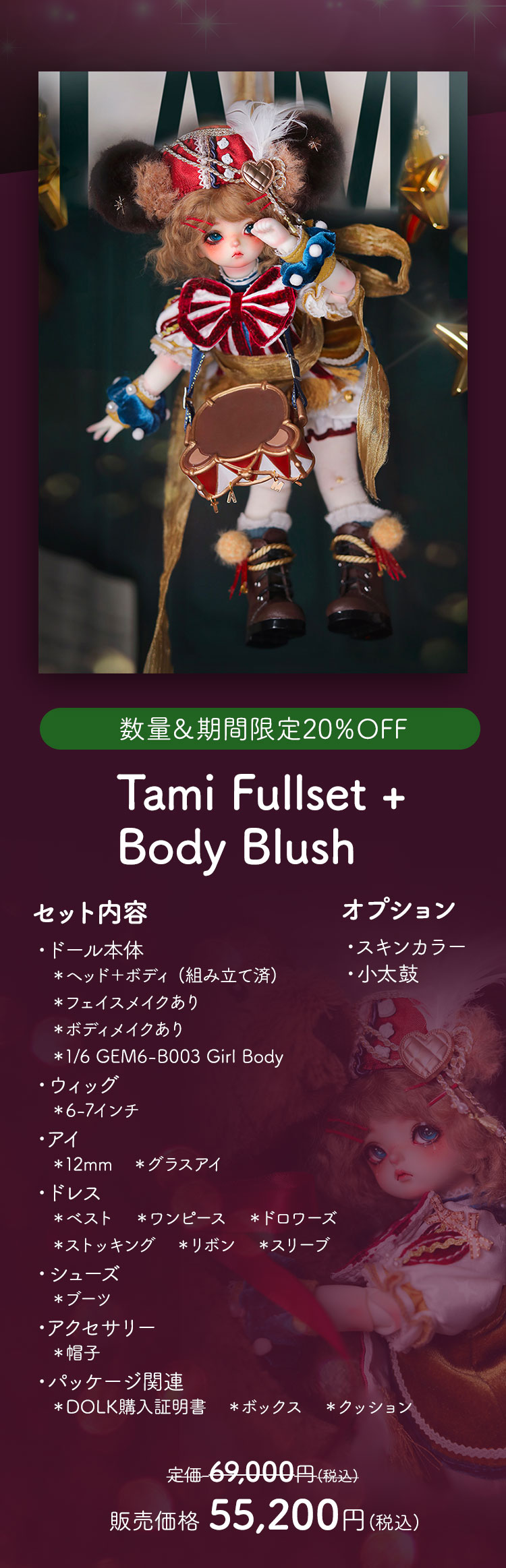 新作リリースキャンペーン キャンペーン期間中、 ①新作ドール『Theo』『Tami』の本体、フルセットが現在の表示価格から【20%OFF】! ②新作『Theo』『Tami』ヘッド単品、アウトフィット、シューズおよびアクセサリー『Harmonica』『Band Drum』が現在の表示価格から【10%OFF】!