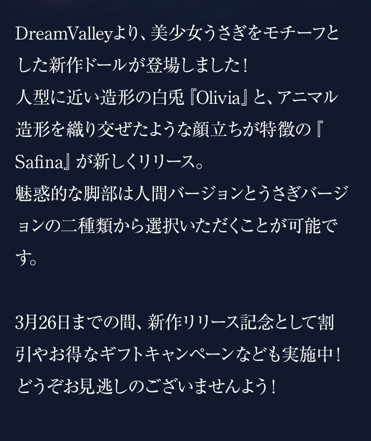 人型に近い造形の白兎『Olivia』と、アニマル造形を織り交ぜたような顔立ちが特徴の『Safina』が新しくリリース。魅惑的な脚部は人間バージョンとうさぎバージョンの二種類から選択いただくことが可能です。 3月26日までの間、新作リリース記念として割引やお得なギフトキャンペーンなども実施中!どうぞお見逃しのございませんよう!