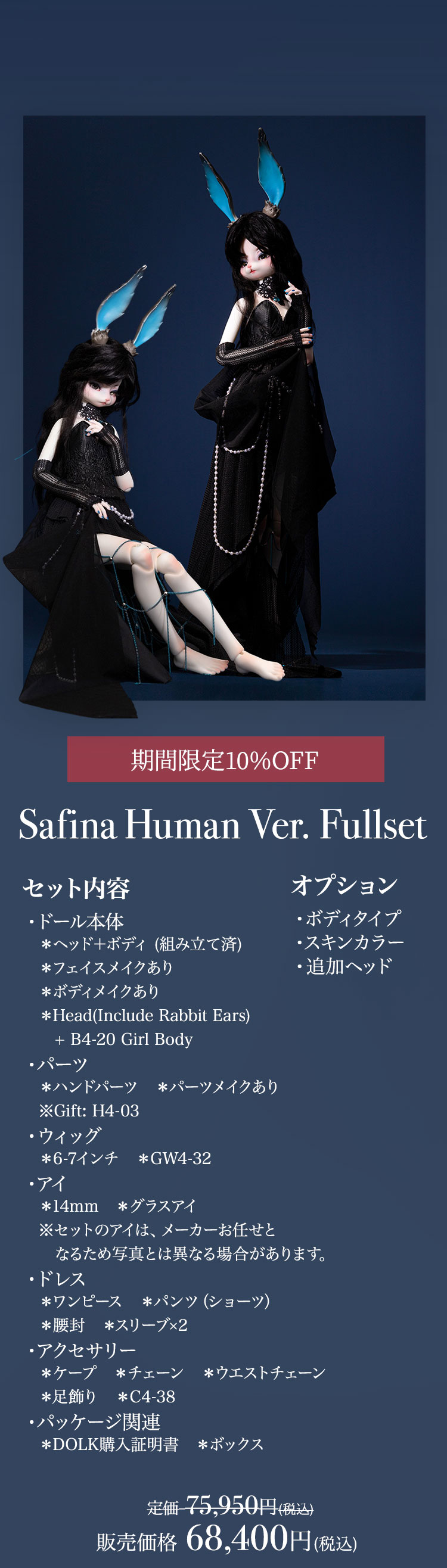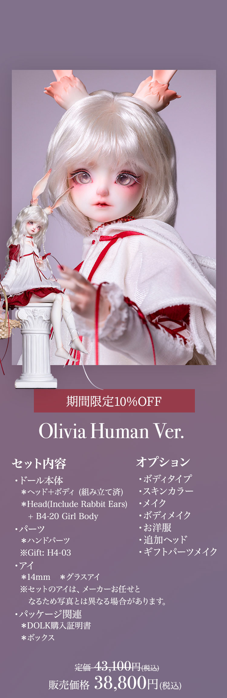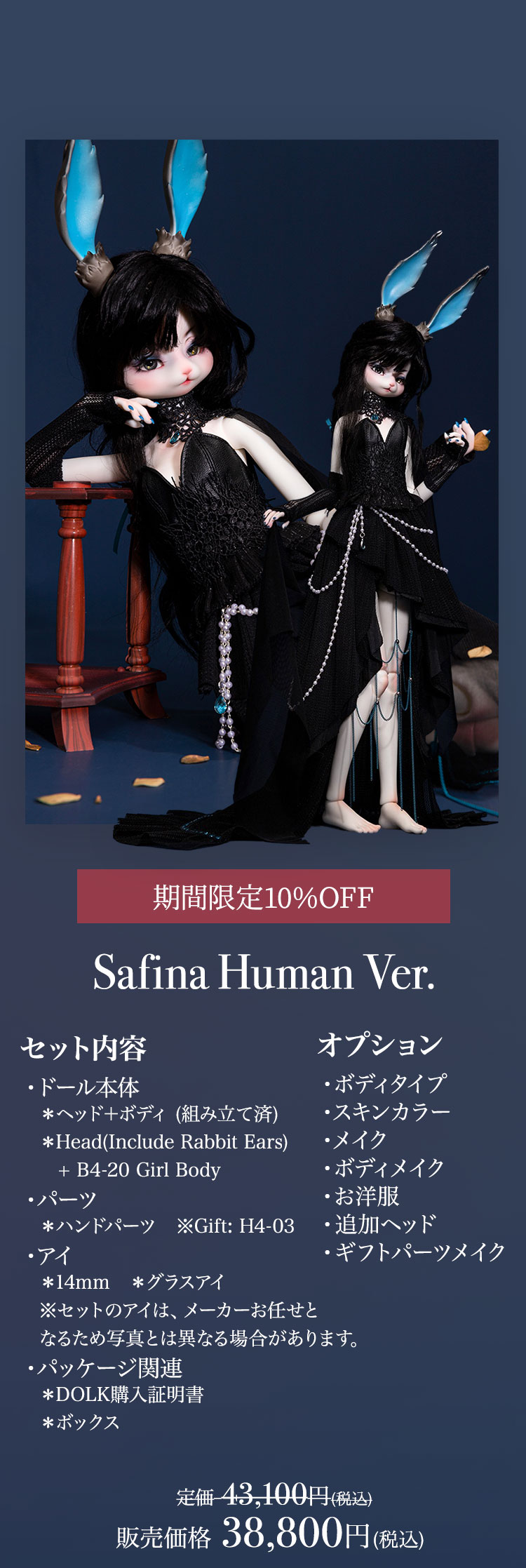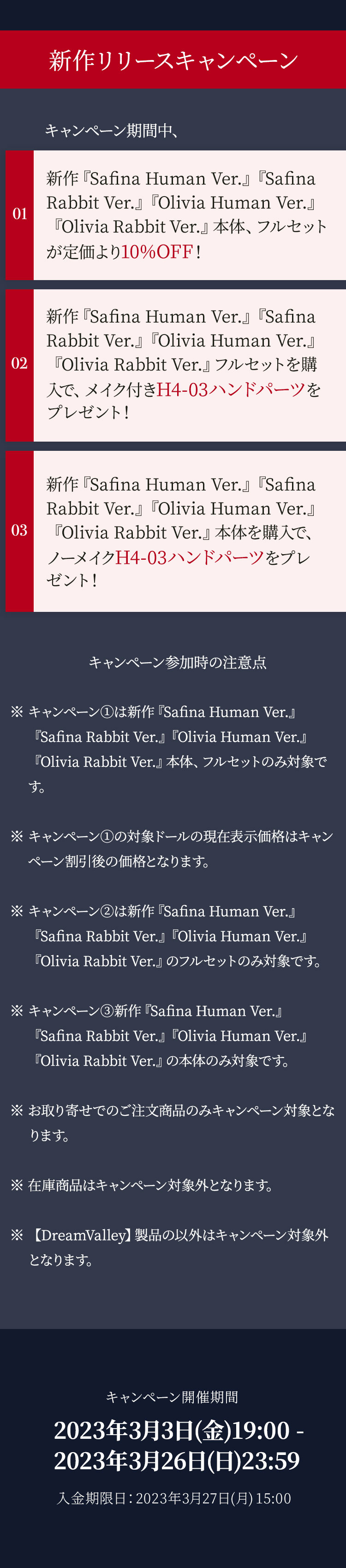 キャンペーン期間中、 ①新作『Safina Human Ver.』『Safina Rabbit Ver.』『Olivia Human Ver.』『Olivia Rabbit Ver.』本体、フルセットが定価より【10%OFF】! ②新作『Safina Human Ver.』『Safina Rabbit Ver.』『Olivia Human Ver.』『Olivia Rabbit Ver.』フルセットを購入で、メイク付き【H4-03ハンドパーツ】をプレゼント! ③新作『Safina Human Ver.』『Safina Rabbit Ver.』『Olivia Human Ver.』『Olivia Rabbit Ver.』本体を購入で、ノーメイク【H4-03ハンドパーツ】をプレゼント!