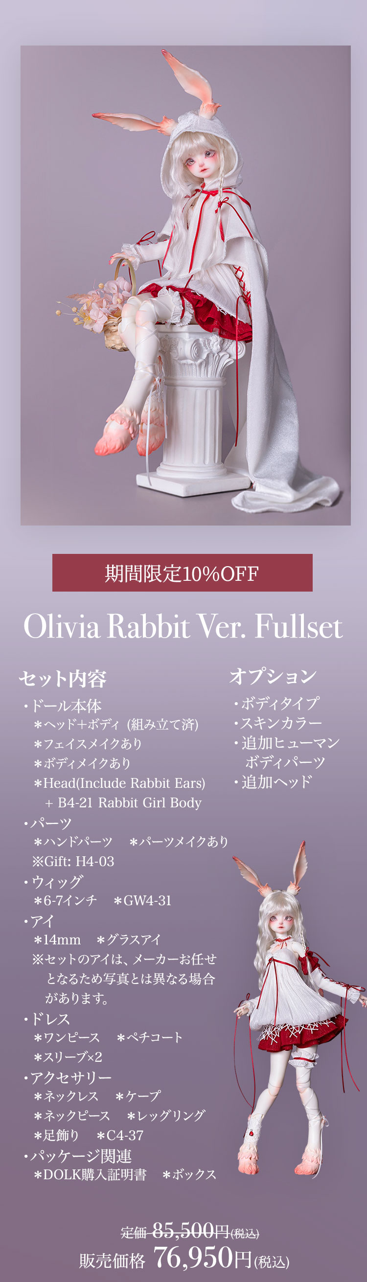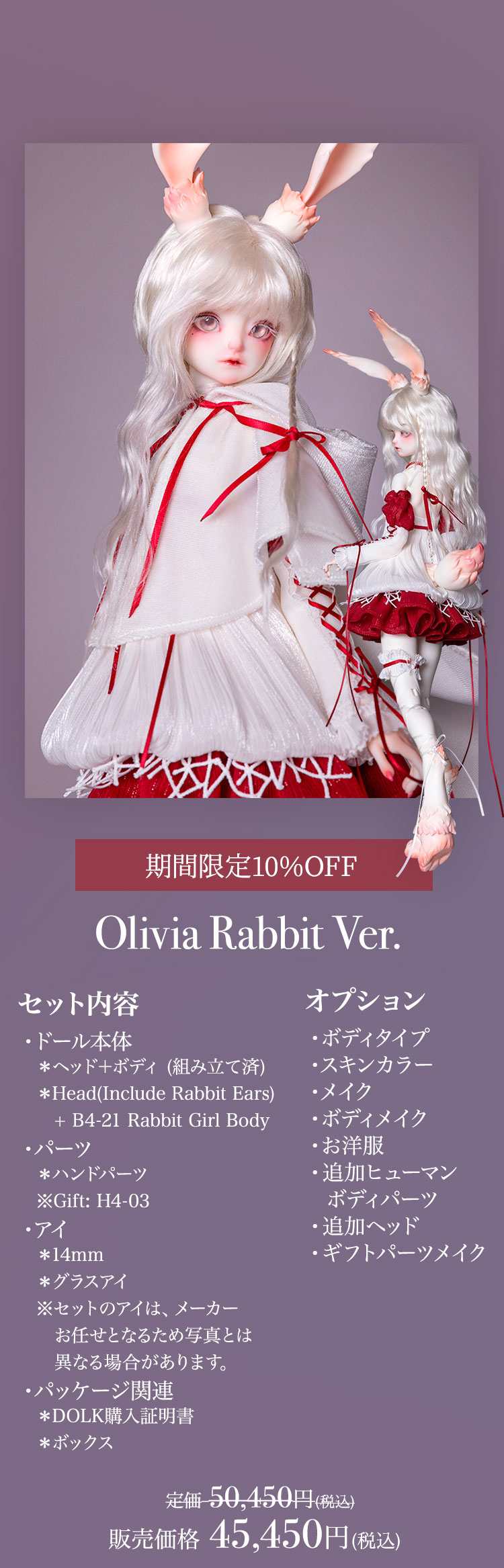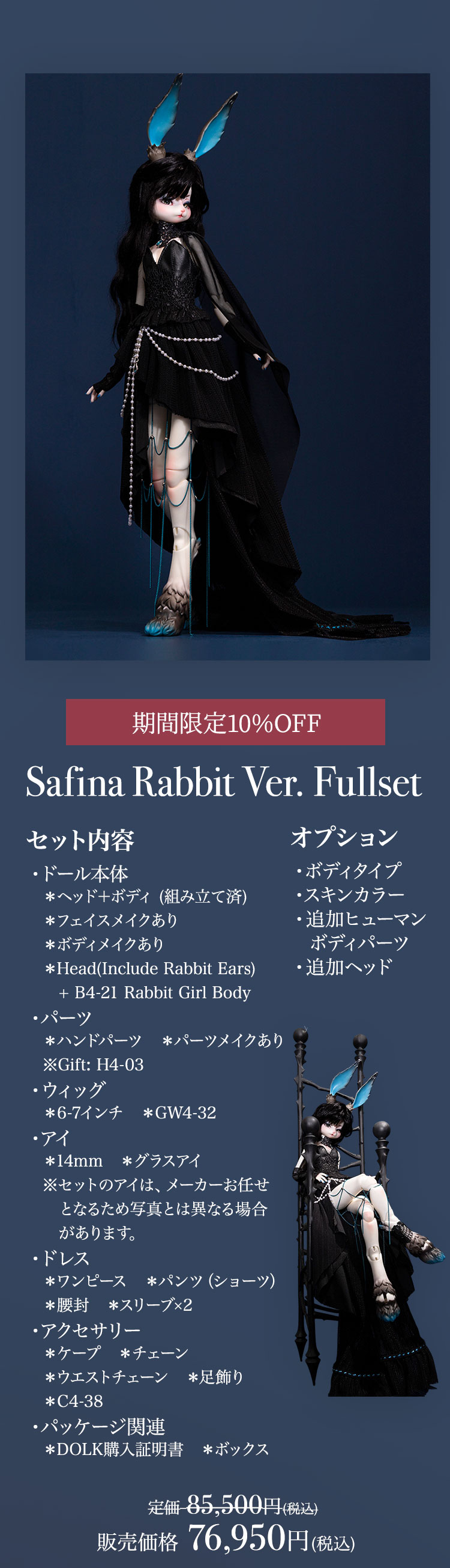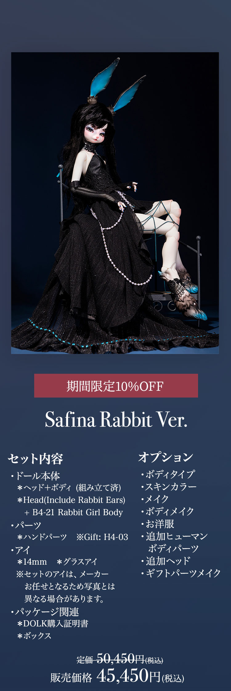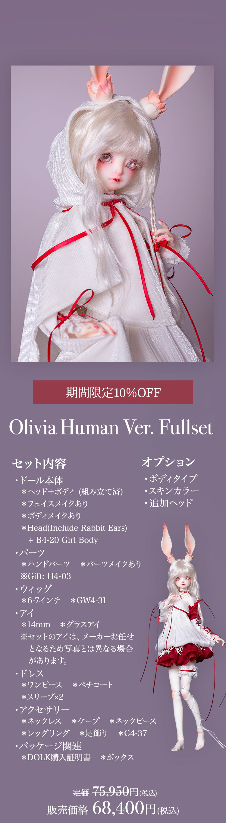 キャンペーン期間中、 ①新作『Safina Human Ver.』『Safina Rabbit Ver.』『Olivia Human Ver.』『Olivia Rabbit Ver.』本体、フルセットが定価より【10%OFF】! ②新作『Safina Human Ver.』『Safina Rabbit Ver.』『Olivia Human Ver.』『Olivia Rabbit Ver.』フルセットを購入で、メイク付き【H4-03ハンドパーツ】をプレゼント! ③新作『Safina Human Ver.』『Safina Rabbit Ver.』『Olivia Human Ver.』『Olivia Rabbit Ver.』本体を購入で、ノーメイク【H4-03ハンドパーツ】をプレゼント!