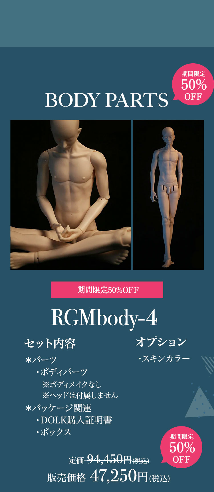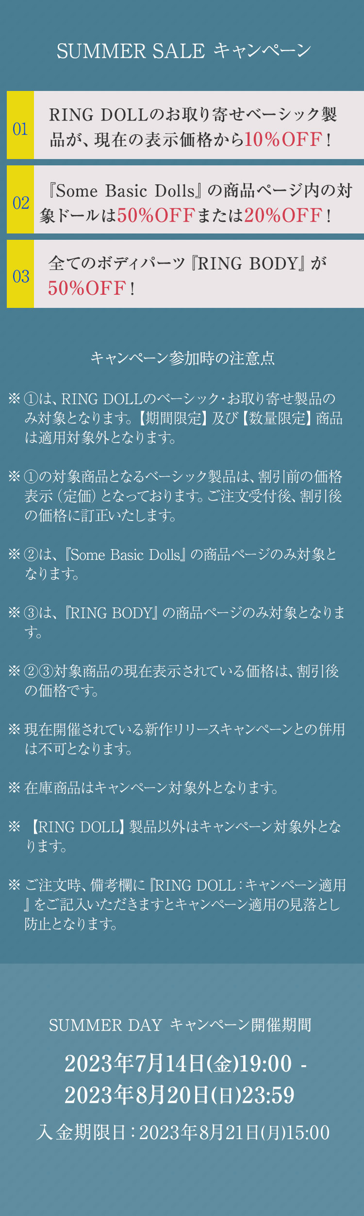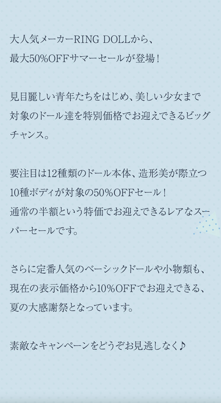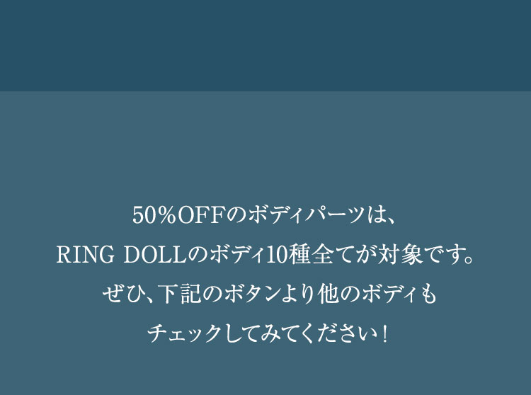 ①RING DOLLのお取り寄せベーシック製品が、現在の表示価格から【10%OFF】! ②『Some Basic Dolls』の商品ページ内の対象ドールは【50%OFF】または【20%OFF】! ③全てのボディパーツ『RING BODY』が【50%OFF】!