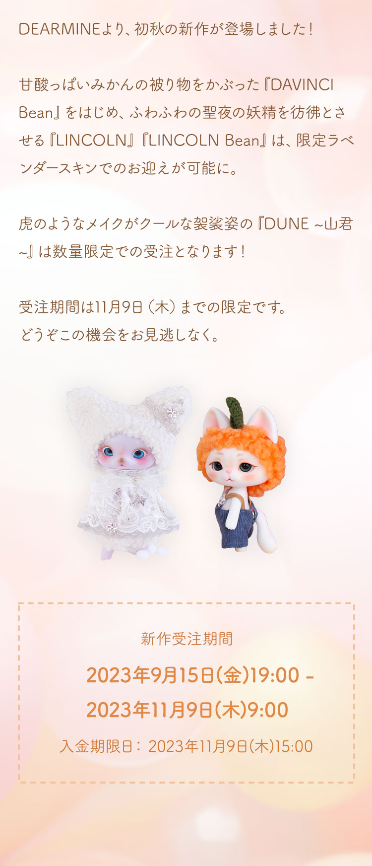 甘酸っぱいみかんの被り物をかぶった『DAVINCI Bean』をはじめ、 ふわふわの聖夜の妖精を彷彿とさせる『LINCOLN』『LINCOLN Bean』は、 限定ラベンダースキンでのお迎えが可能に。 虎のようなメイクがクールな袈裟姿の『DUNE ~山君~』は数量限定での受注となります! 受注期間は11月9日(木)までの限定です。 どうぞこの機会をお見逃しなく。