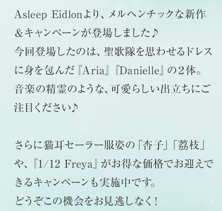 今回登場したのは、聖歌隊を思わせるドレスに身を包んだ『Aria』『Danielle』の2体。 音楽の精霊のような、可愛らしい出立ちにご注目ください♪ さらに猫耳セーラー服姿の「杏子」「荔枝」や、『1/12 Freya』がお得な価格でお迎えできるキャンペーンも実施中です。 どうぞこの機会をお見逃しなく!