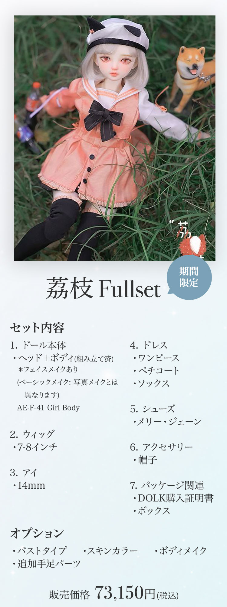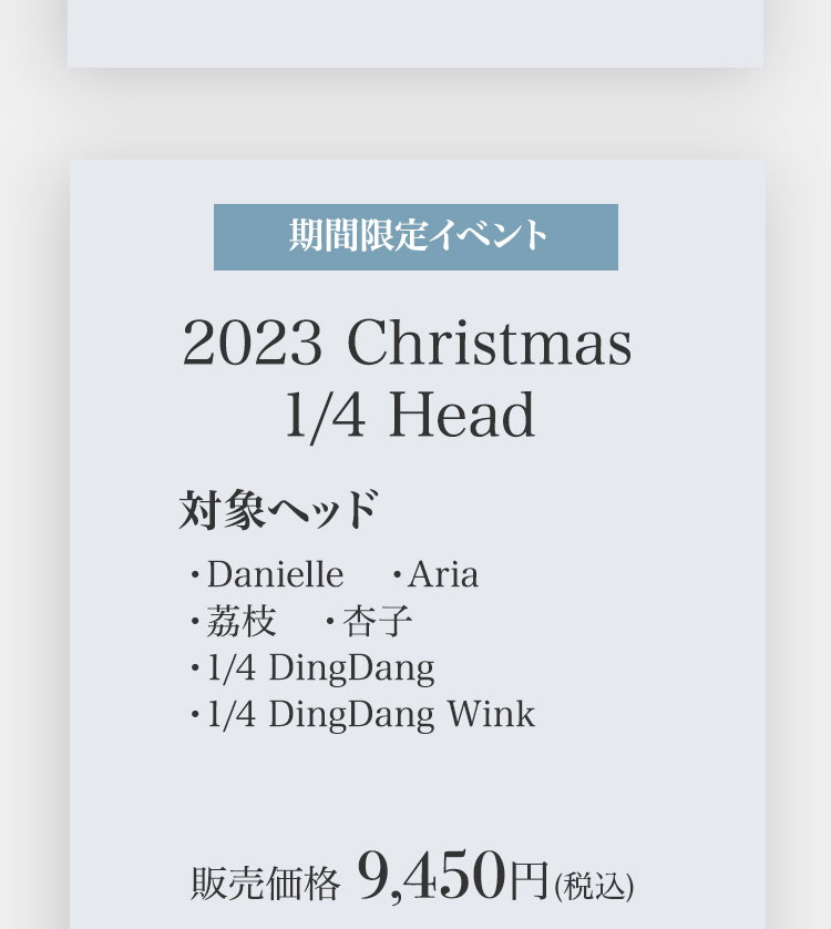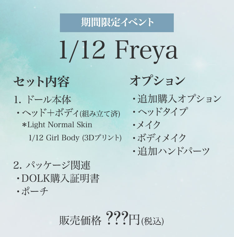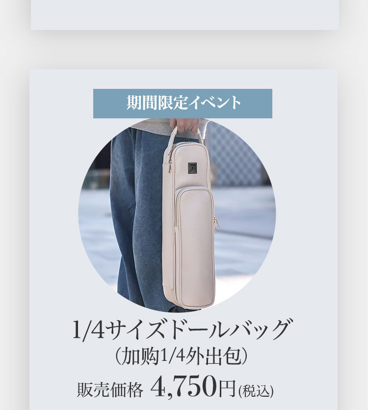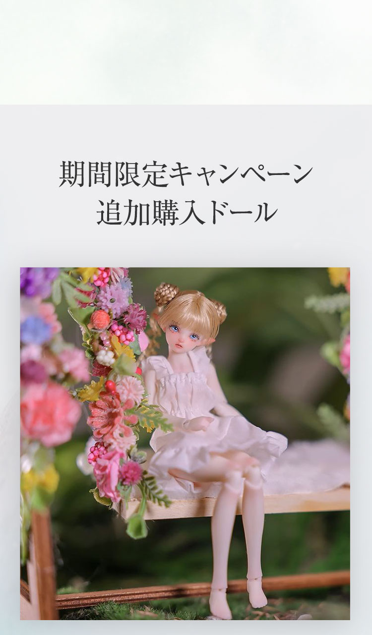 キャンペーン期間中に、 ①Asleep Eidolon製1/3サイズドールセットをご購入される方限定で、【1/12 Freya】1体もしくは【1/3サイズヘッド】1点を【特別価格】にて追加購入可能! ②Asleep Eidolon製1/4サイズドールセットをご購入される方限定で、【1/12 Freya】1体もしくは【1/4サイズヘッド】1点を【特別価格】にて追加購入可能! ③Asleep Eidolon製1/4サイズドールセットをご購入される方限定で、【4,750円(税込)】で【特製ドールバッグ】1点を追加購入可能! ④一部キャンペーン対象ドールは定価より【15%OFF】価格にてご購入可能!