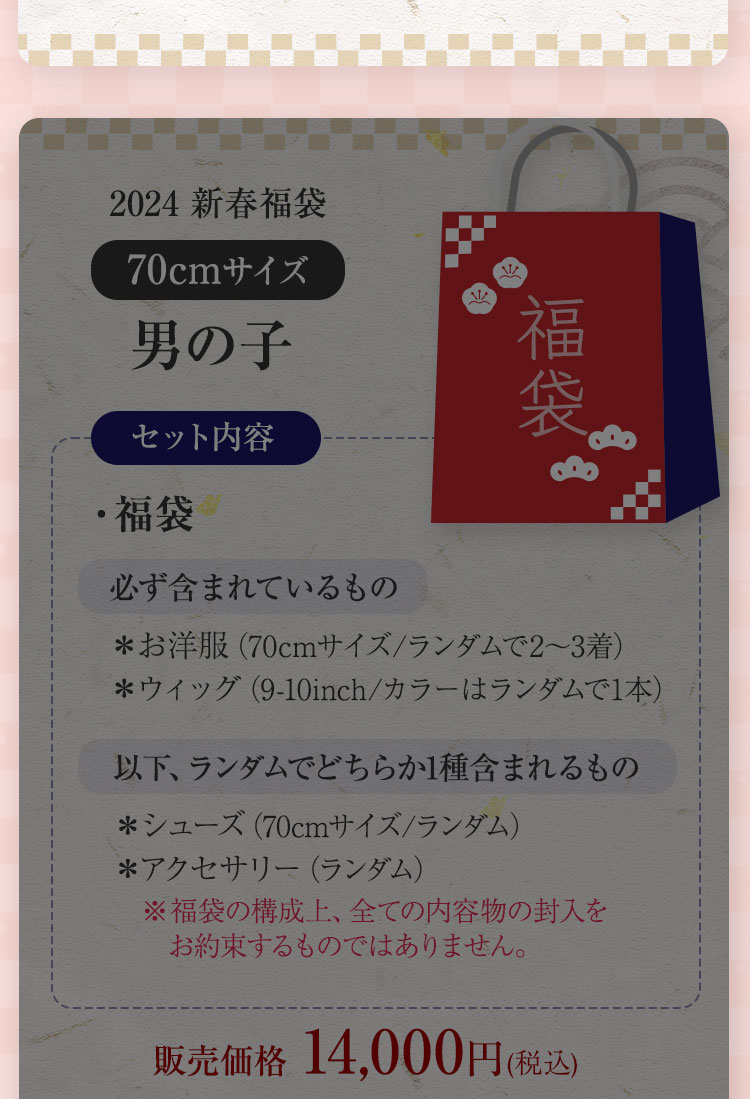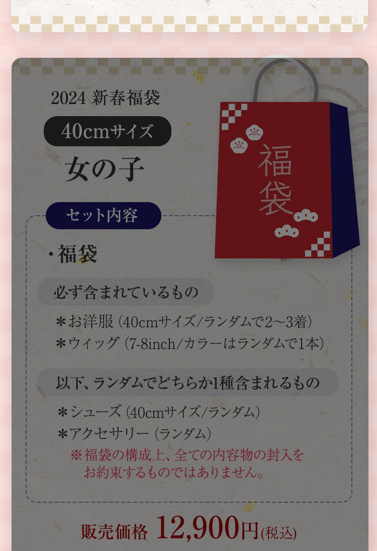 DOLKより日頃のご愛顧に感謝の気持ちを込めて、皆様に充実したドールライフを送っていただくために、 毎年大好評の2024年初売りのお得な福袋をご用意いたしました! お洋服・ウィッグ・シューズ・アクセサリーなど選りすぐりのアイテムがお得にお迎えいただけます。 おひとりさま何点でもご購入可能です! 数に限りがございますので、この機会をどうぞお見逃しなく!
