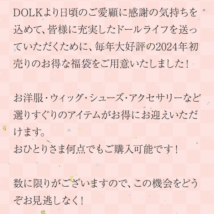 DOLKより日頃のご愛顧に感謝の気持ちを込めて、皆様に充実したドールライフを送っていただくために、 毎年大好評の2024年初売りのお得な福袋をご用意いたしました! お洋服・ウィッグ・シューズ・アクセサリーなど選りすぐりのアイテムがお得にお迎えいただけます。 おひとりさま何点でもご購入可能です! 数に限りがございますので、この機会をどうぞお見逃しなく!