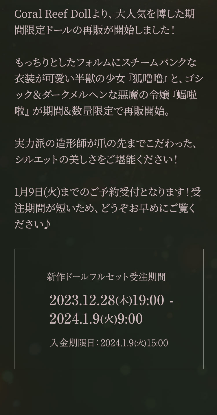 新作ドールフルセット受注期間:2023.12.28(木)19:00 - 2024.1.9(火)9:00