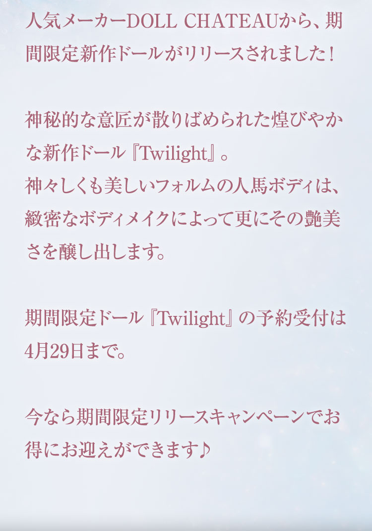 キャンペーン期間中、 ①新作ドール『Twilight』『Twilight Fullset』が定価より【7%OFF】! ②新作パーツ『Twilight Head』『Twilight Wand』が定価より【5%OFF】!