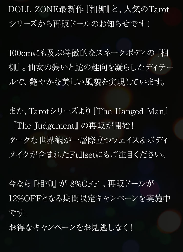 100cmにも及ぶ特徴的なスネークボディの『相柳』。 仙女の装いと蛇の趣向を凝らしたディテールで、艶やかな美しい風貌を実現しています。 また、Tarotシリーズより『The Hanged Man』『The Judgement』の再販が開始! ダークな世界観が一層際立つフェイス&ボディメイクが含まれたFullsetにもご注目ください。 今なら『相柳』が 8%OFF 、再販ドールが12%OFFとなる期間限定キャンペーンを実施中です。 お得なキャンペーンをお見逃しなく!