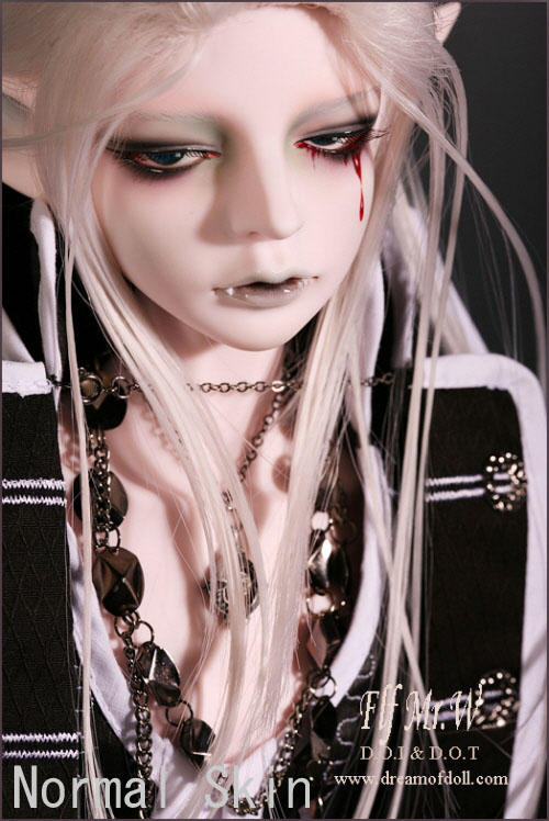 銀髪と左目から流れる赤い涙が悲しさを物語っています。ホワイトスキンメイクは口元とを強調するかのようなアイシャドウが特徴です。