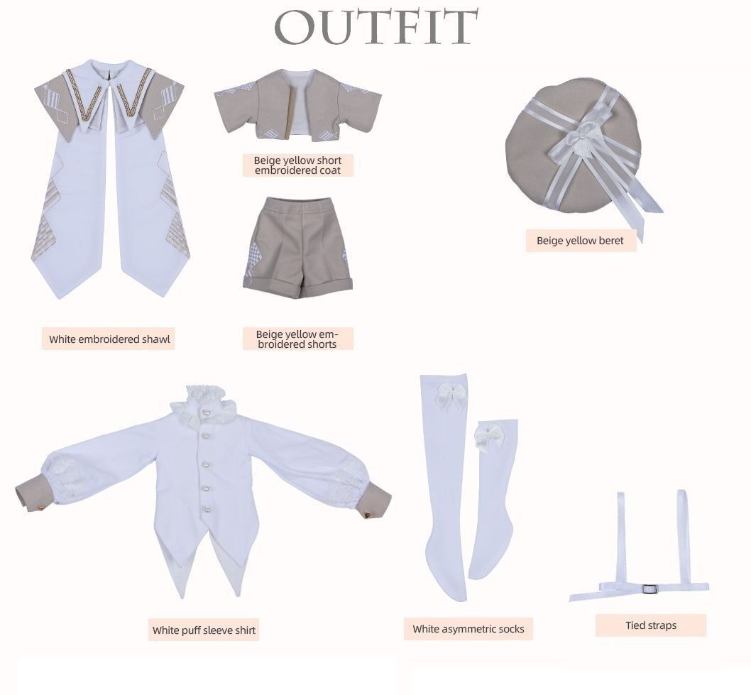 ショール、ショートジャケット、ショートパンツ、シャツ、ベレー帽、ストラップ、ソックス