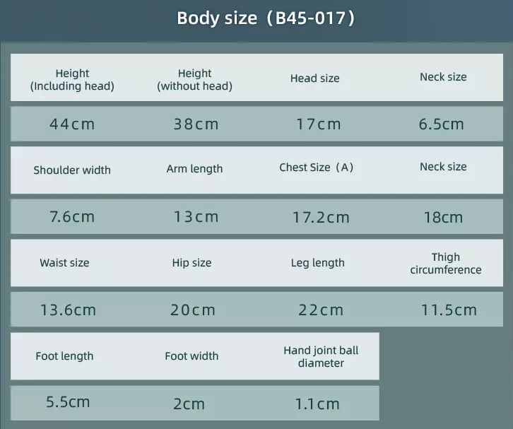 | B45-017 Girl: A (S胸) | 44 | 20 | 6.5 | 7.6 | 17.2 | 13.6 | 20 | 13 | --- | 22 | 11.5 | 5.5 | 2 | 6~7 | 14 |