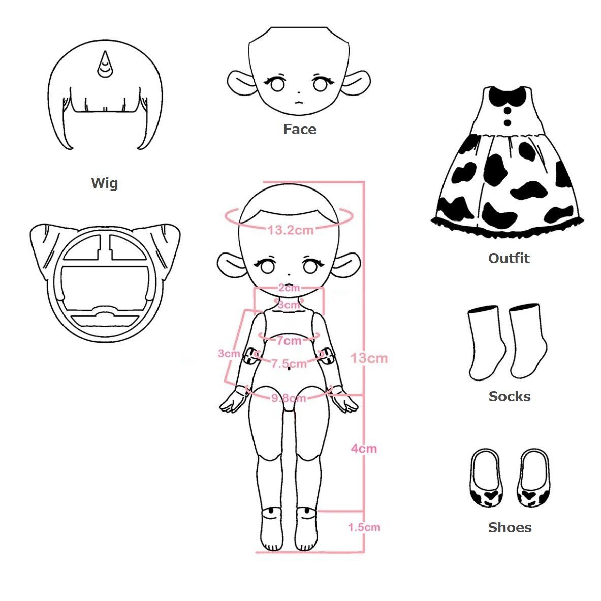 ※ 各サイズはメーカー公式データを記載しています。実際のドール・アイテムには個体差により多少の誤差があります。