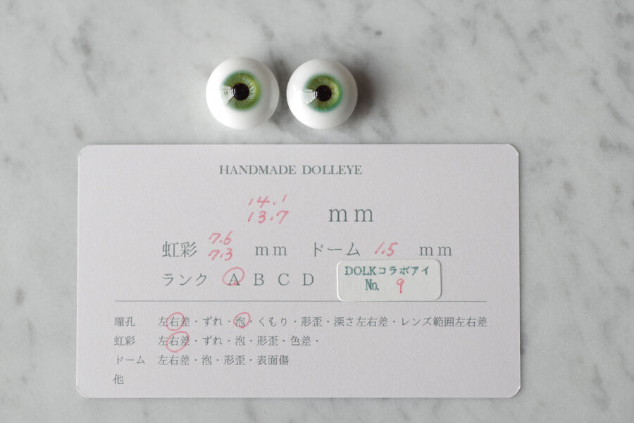 ※ レンズ部に細かい泡あり、ハンドメイドのため左右での色差、黒目の大きさやドームの高さの左右差など左右で同じ出来ではありません。予めご了承ください。
