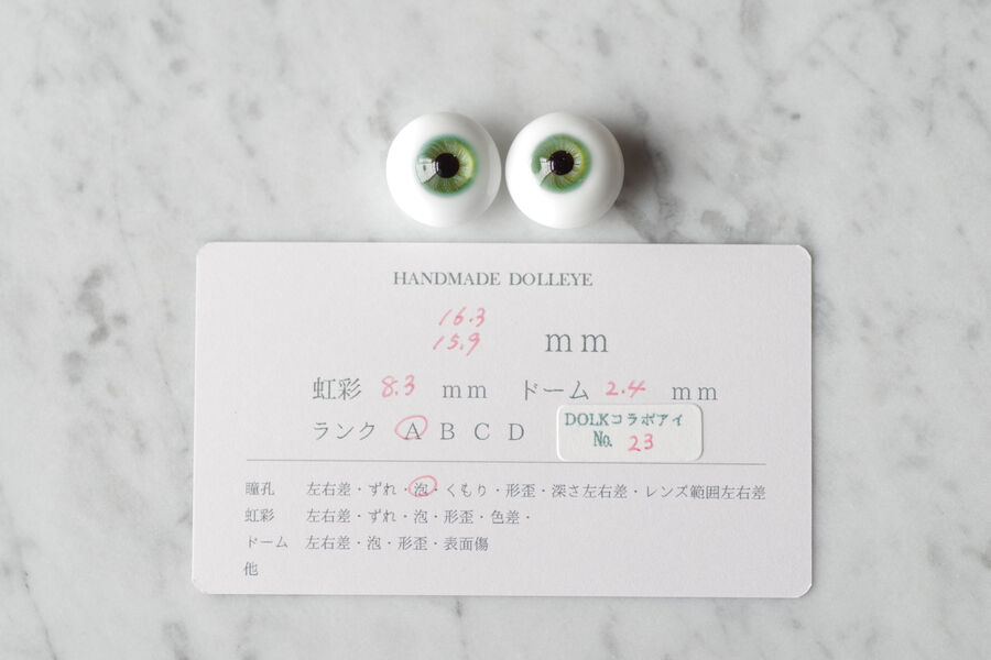 ※ レンズ部に細かい泡あり、ハンドメイドのため左右での色差、黒目の大きさやドームの高さの左右差など左右で同じ出来ではありません。予めご了承ください。