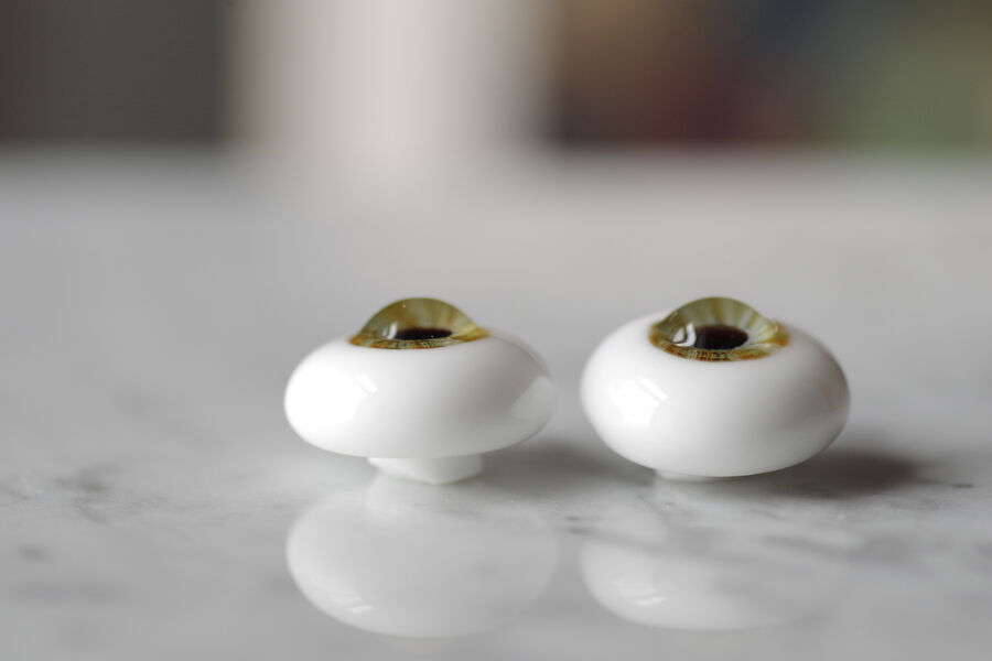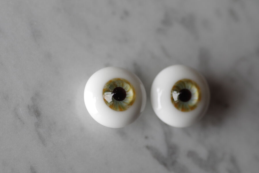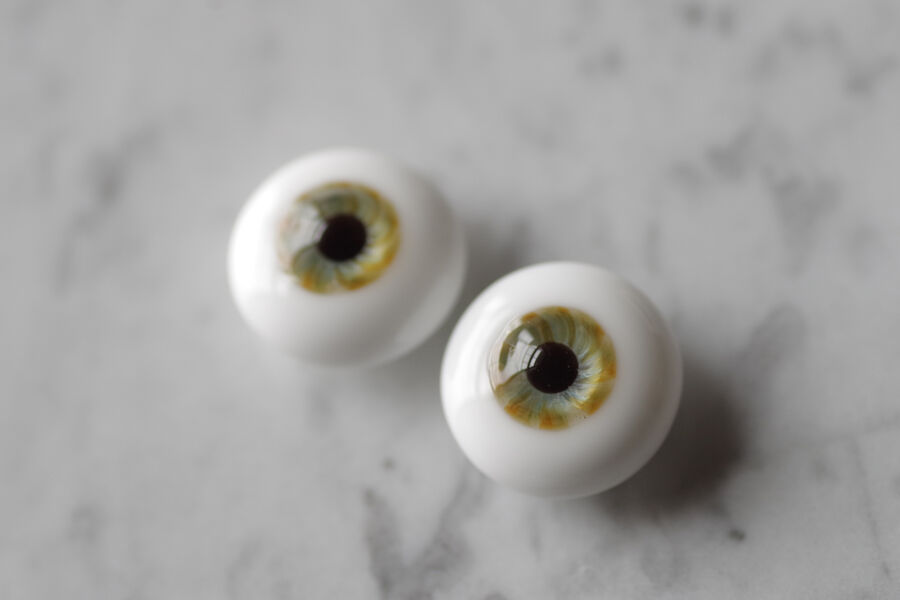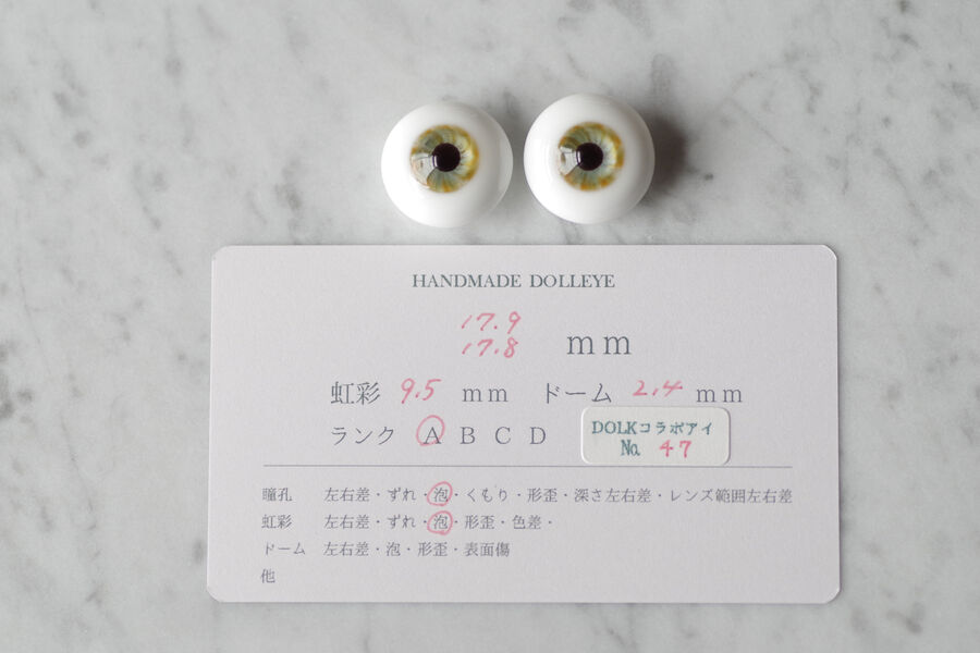 ※ レンズ部に細かい泡あり、ハンドメイドのため左右での色差、黒目の大きさやドームの高さの左右差など左右で同じ出来ではありません。予めご了承ください。