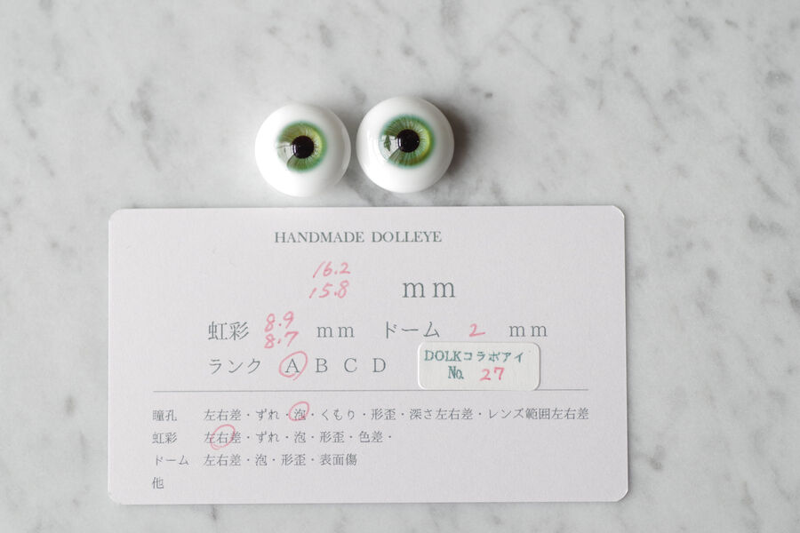 ※ レンズ部に細かい泡あり、ハンドメイドのため左右での色差、黒目の大きさやドームの高さの左右差など左右で同じ出来ではありません。予めご了承ください。